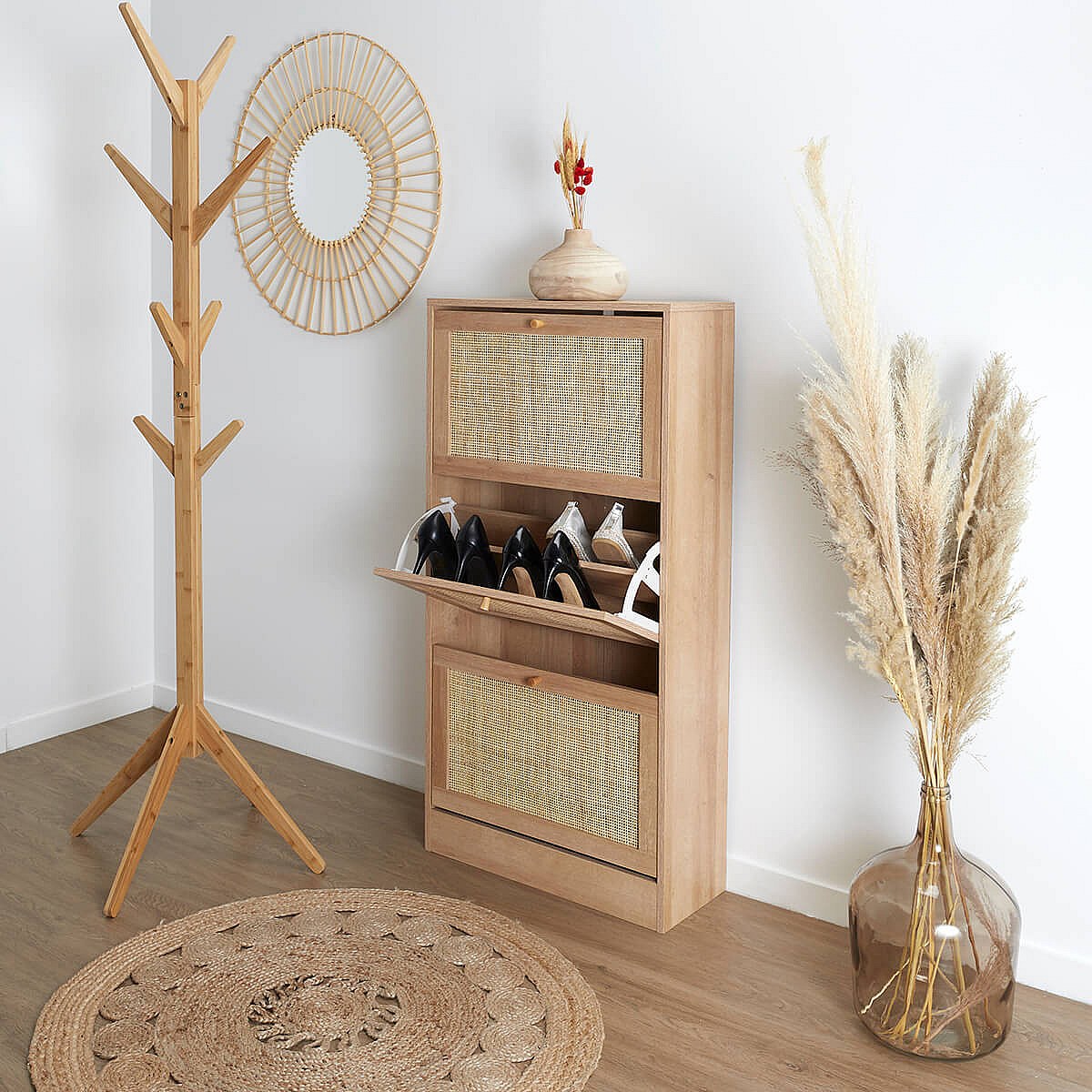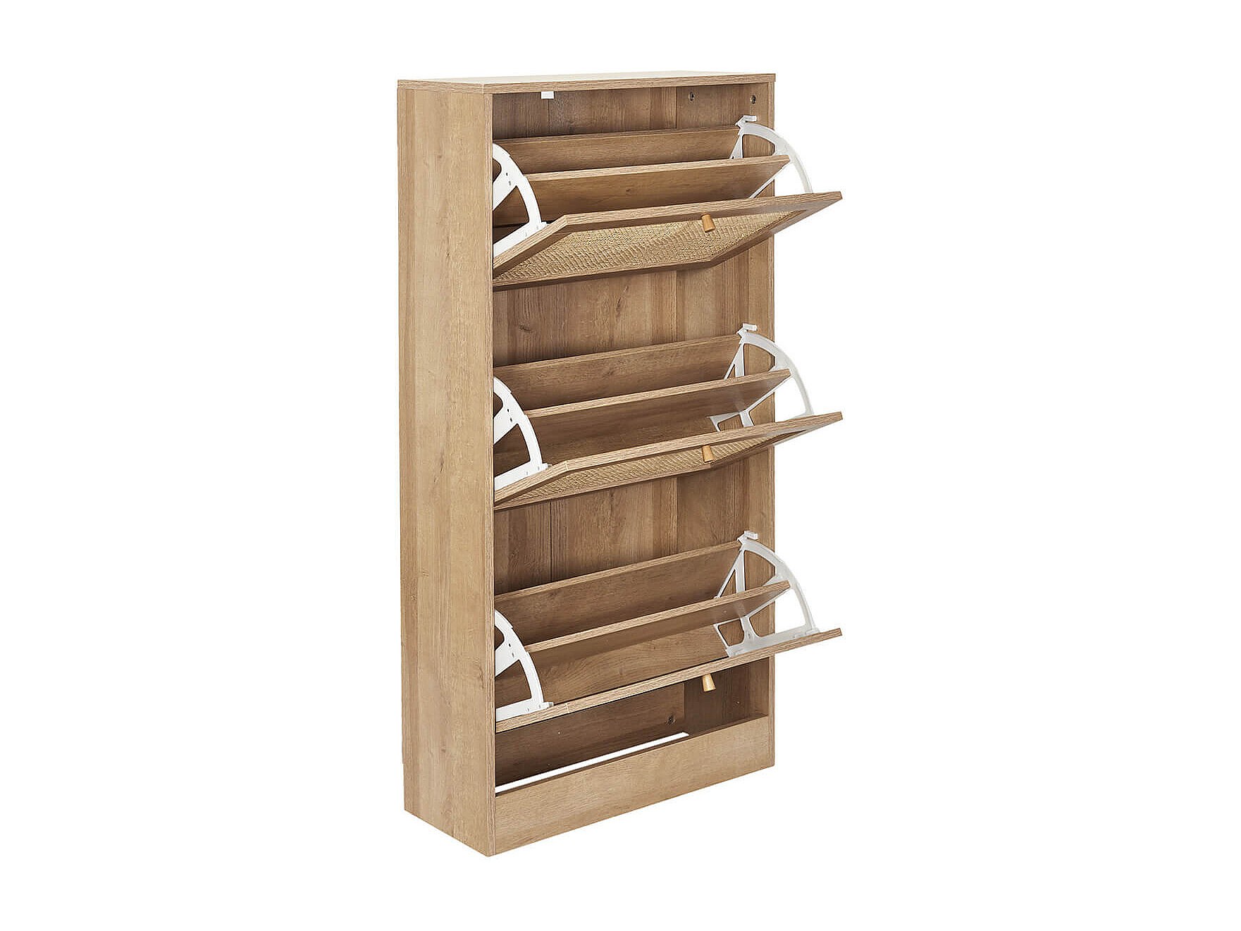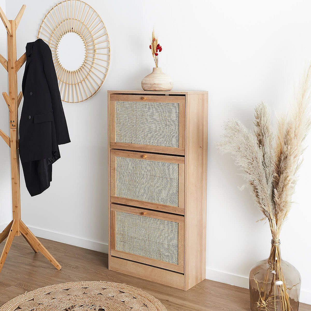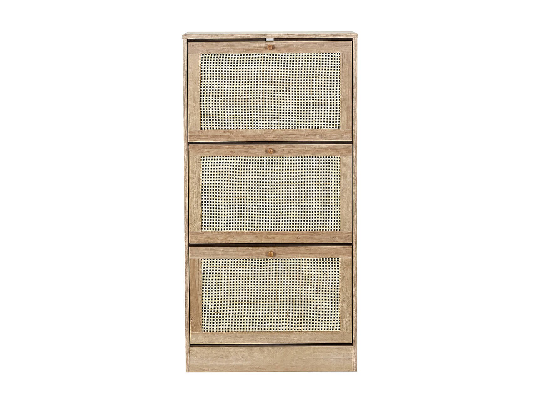 MAYA - Meuble à Chaussures 3 Portes Basculantes Effet Bois et Façades Rotin