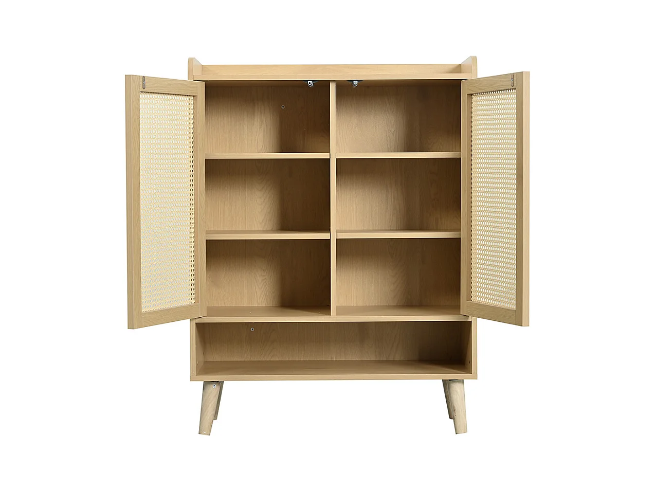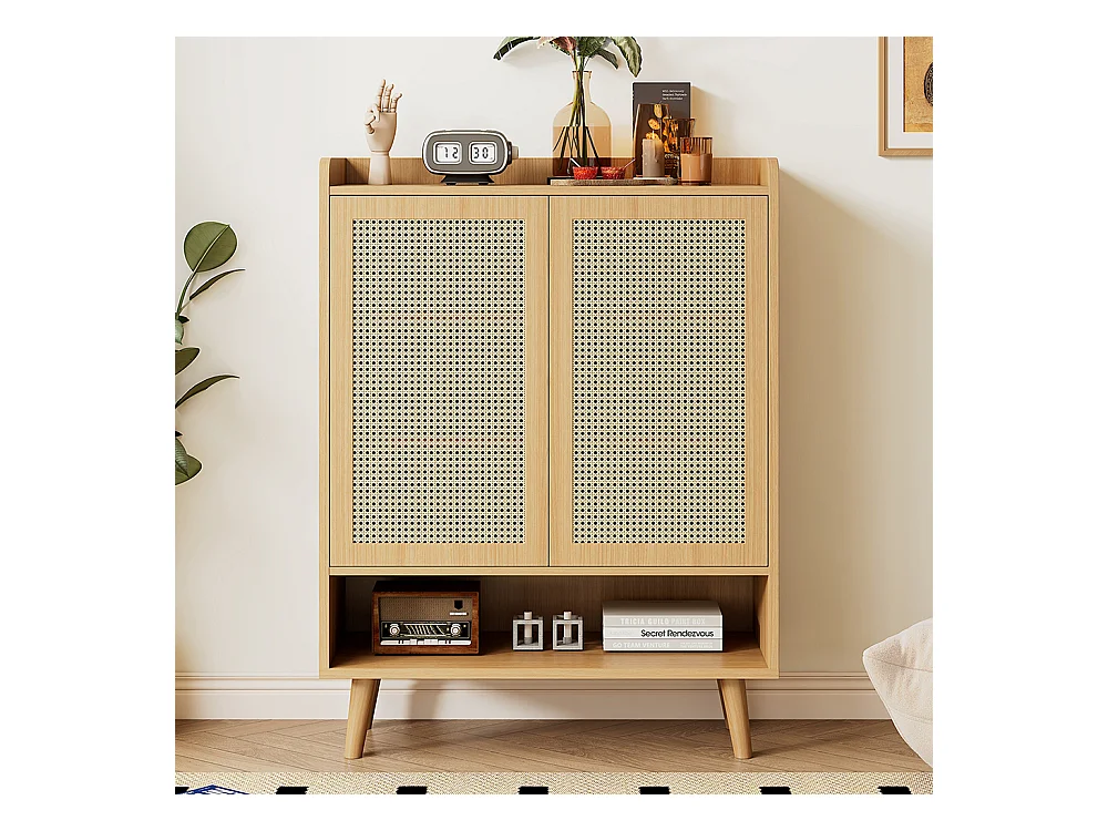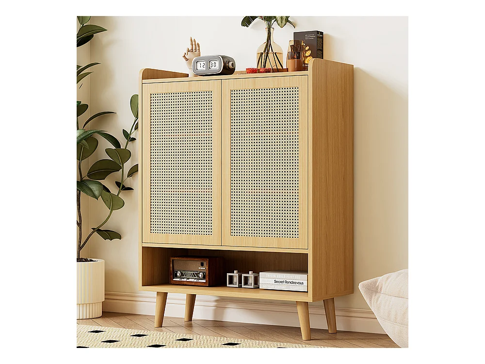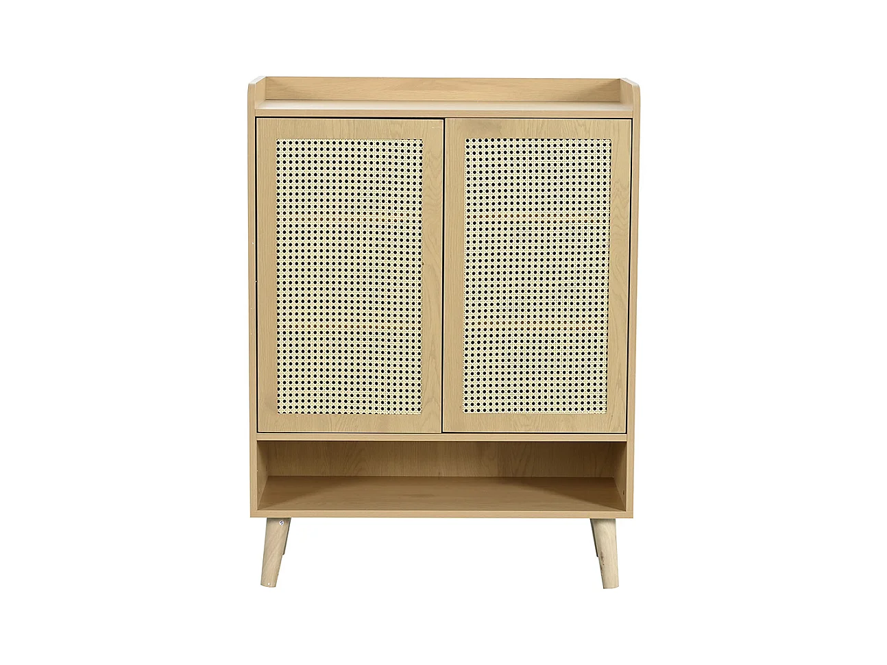 Meuble à chaussures couleur naturelle avec 2 portes en rotin, poignées et pieds en bois