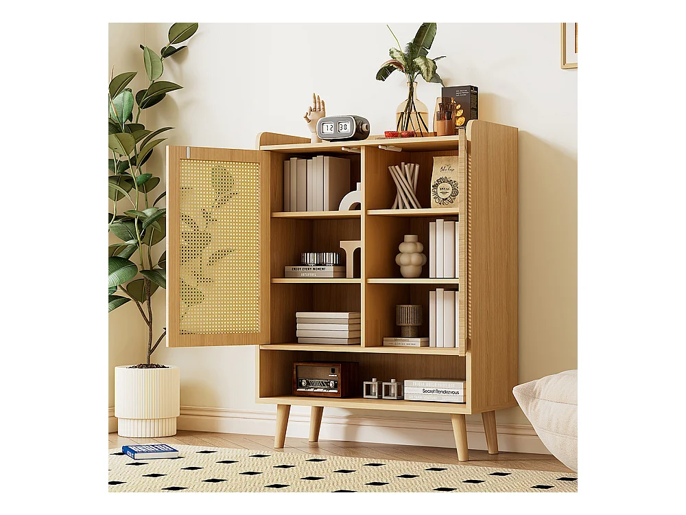 Meuble à chaussures élégant extérieur arrondi portes rotin trois étagères naturel