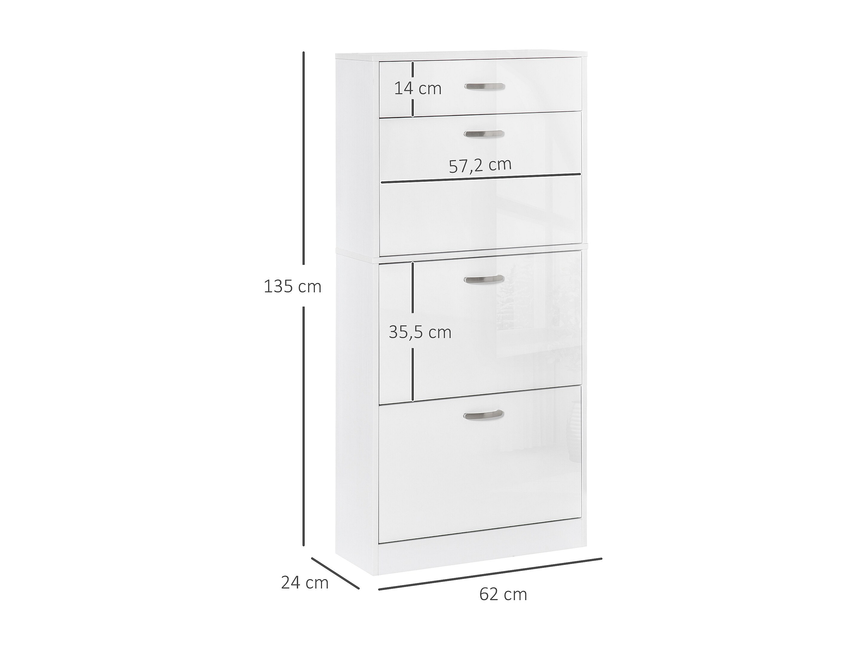 Meuble à chaussures - 3 portes abattantes et tiroir coulissant - dim. 62L x 24l x 135H cm - poignées alu. panneaux particules blanc