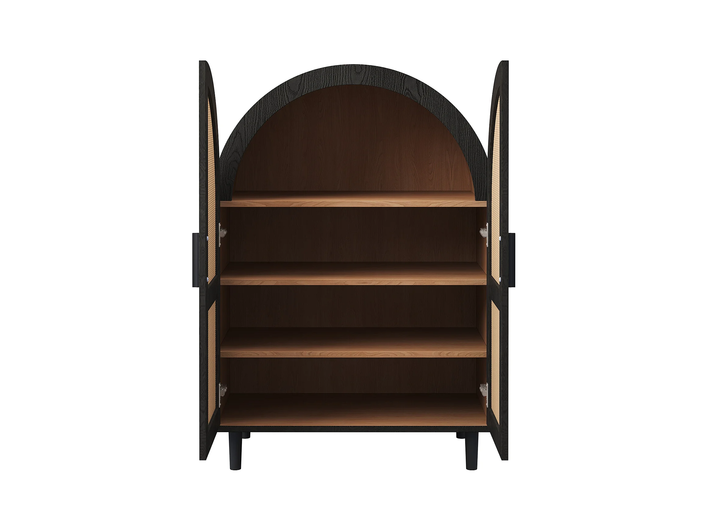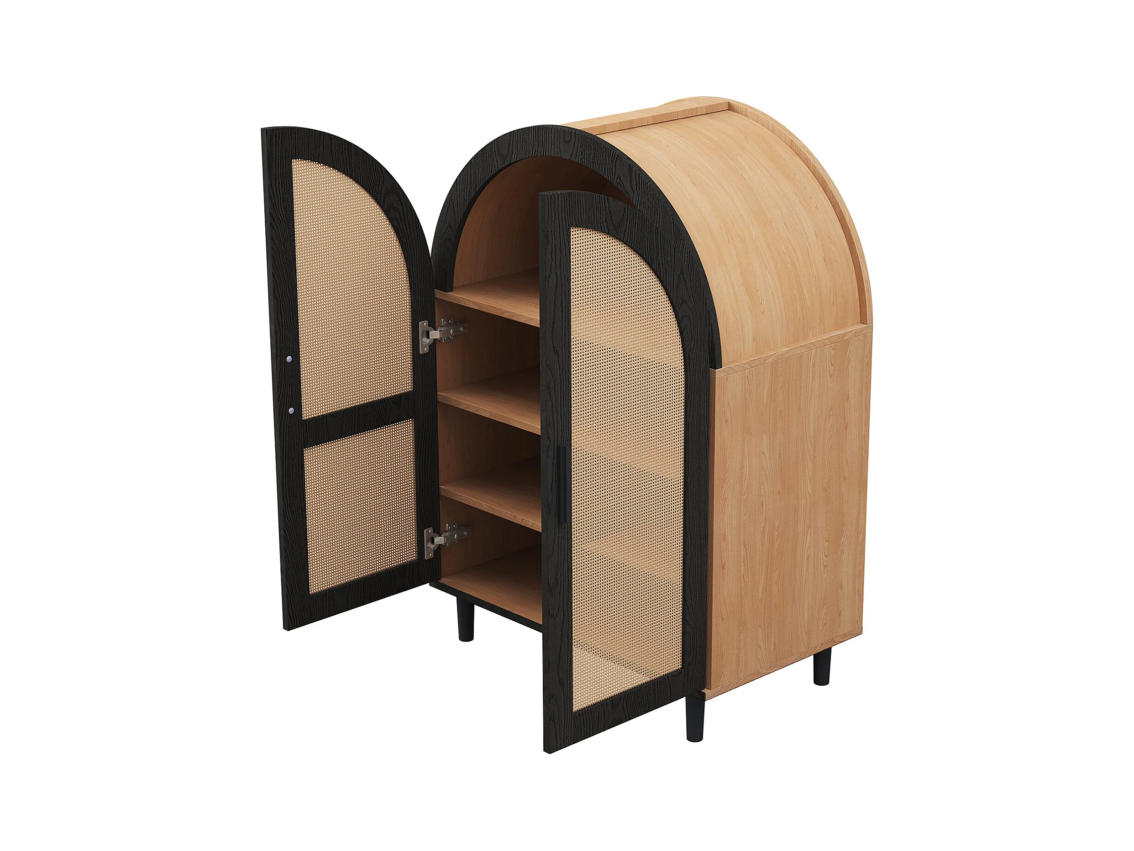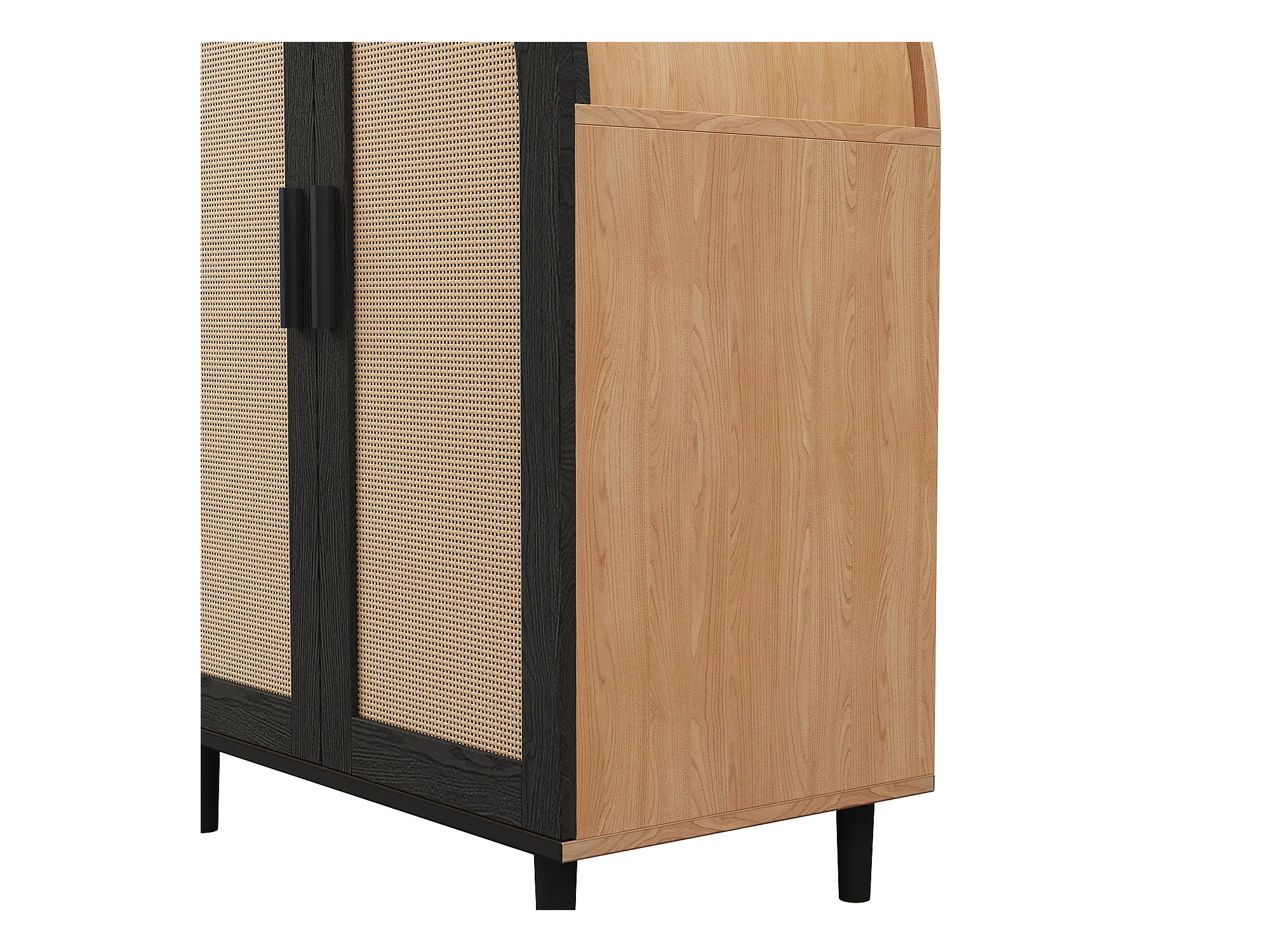 Meuble à chaussures élégant extérieur arrondi portes rotin trois étagères naturel