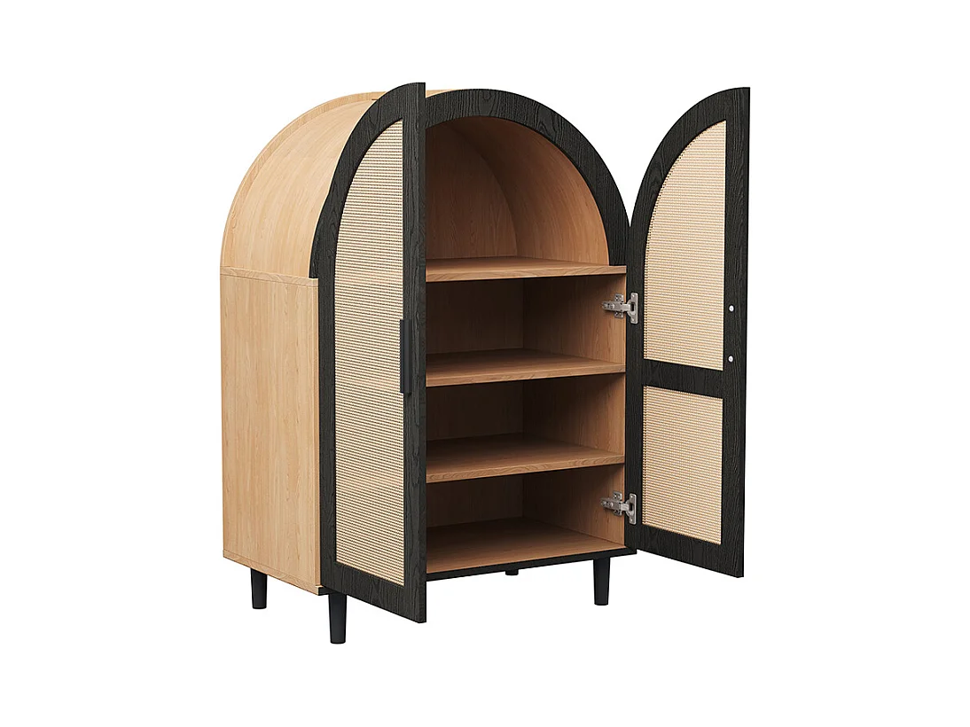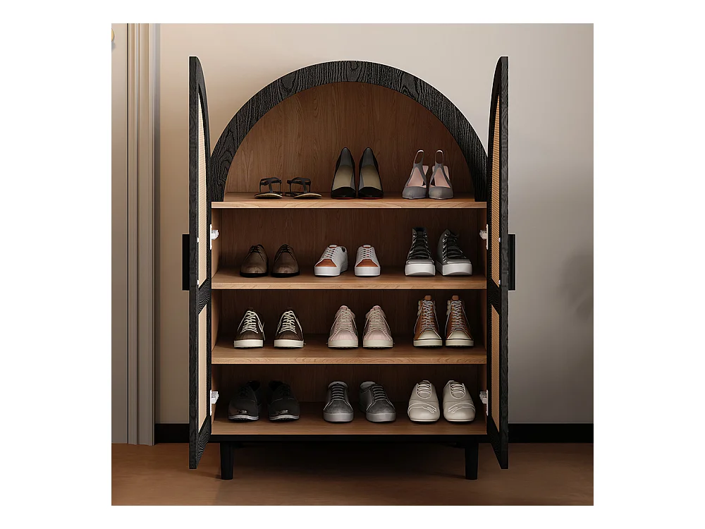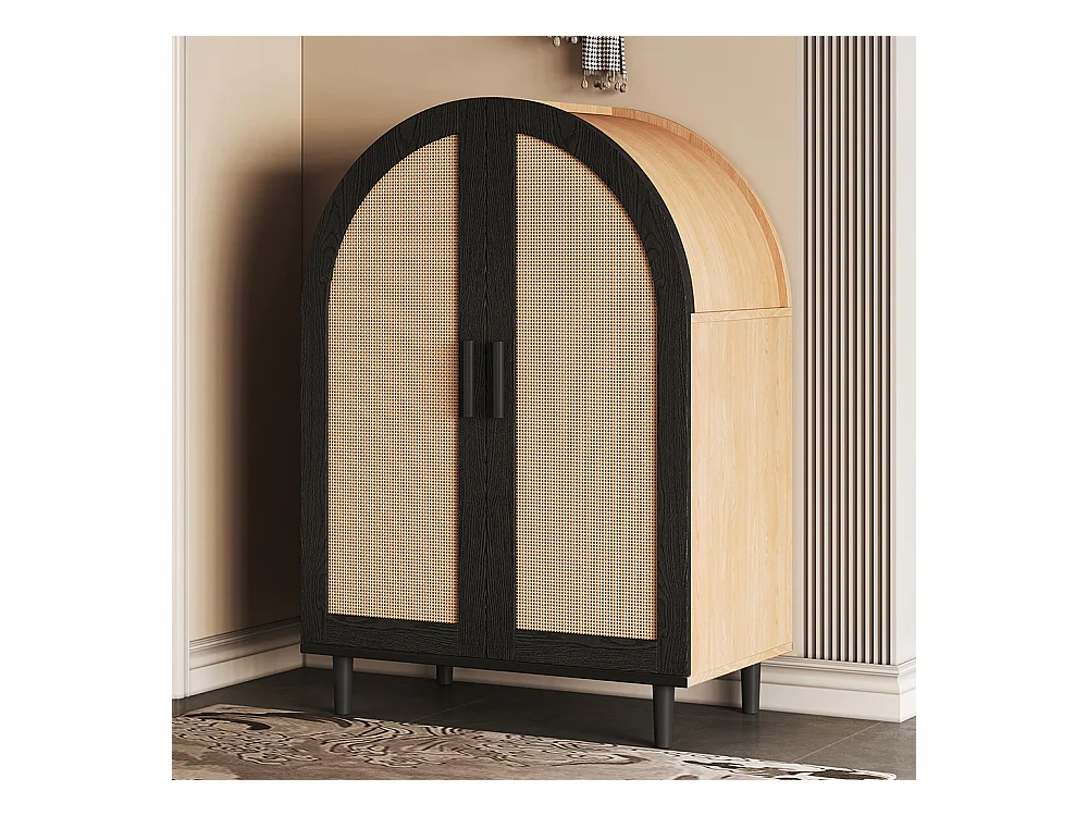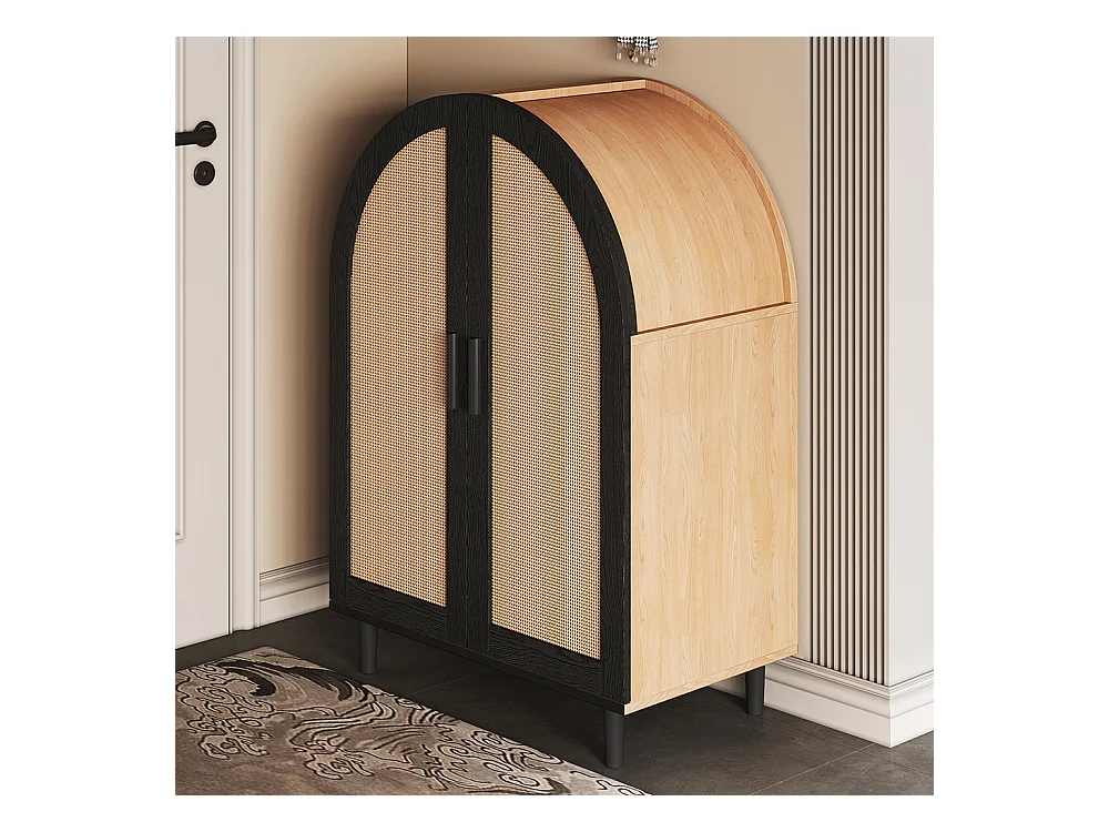 Meuble à chaussures élégant extérieur arrondi portes rotin trois étagères naturel
