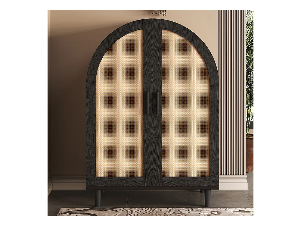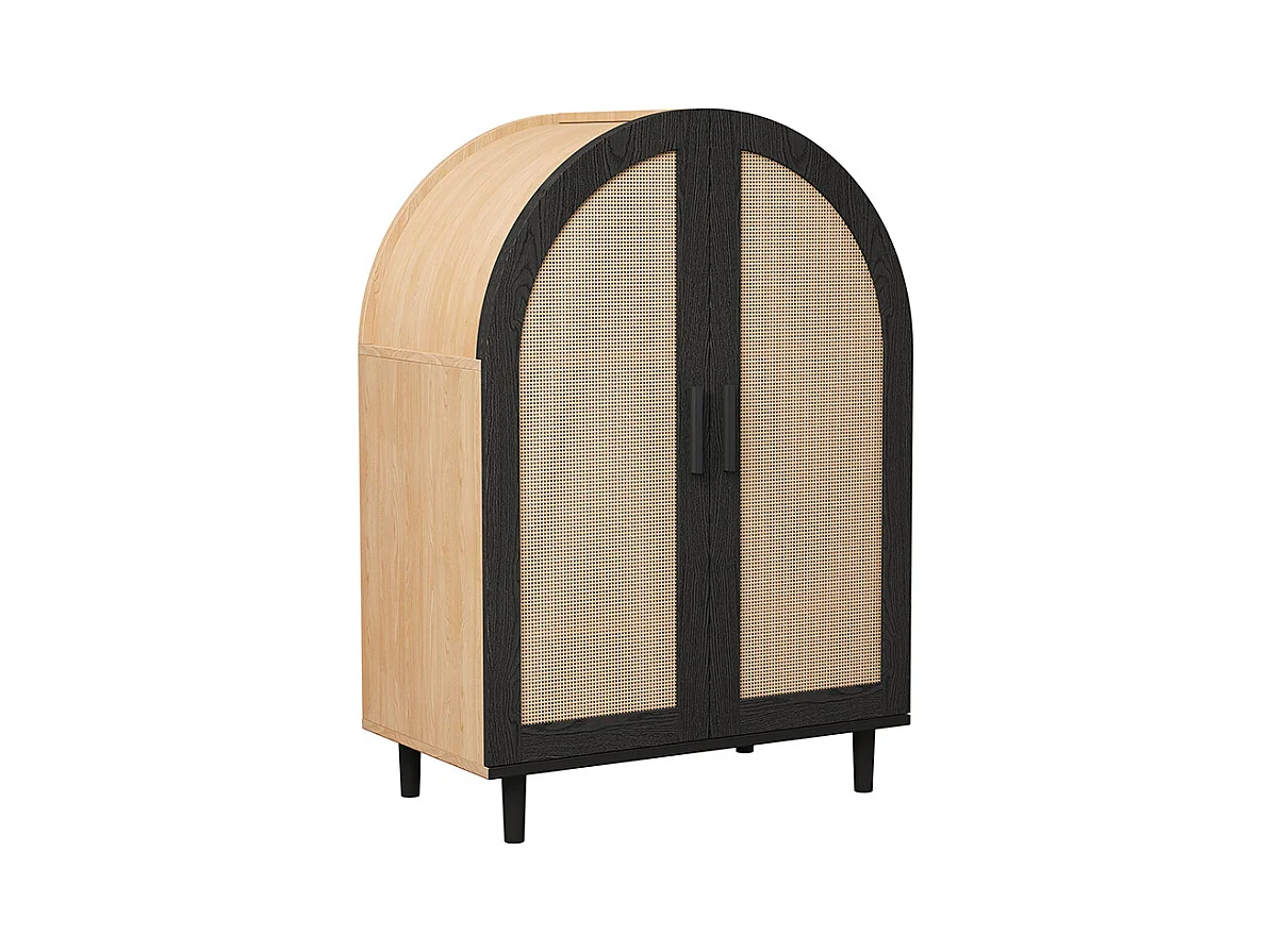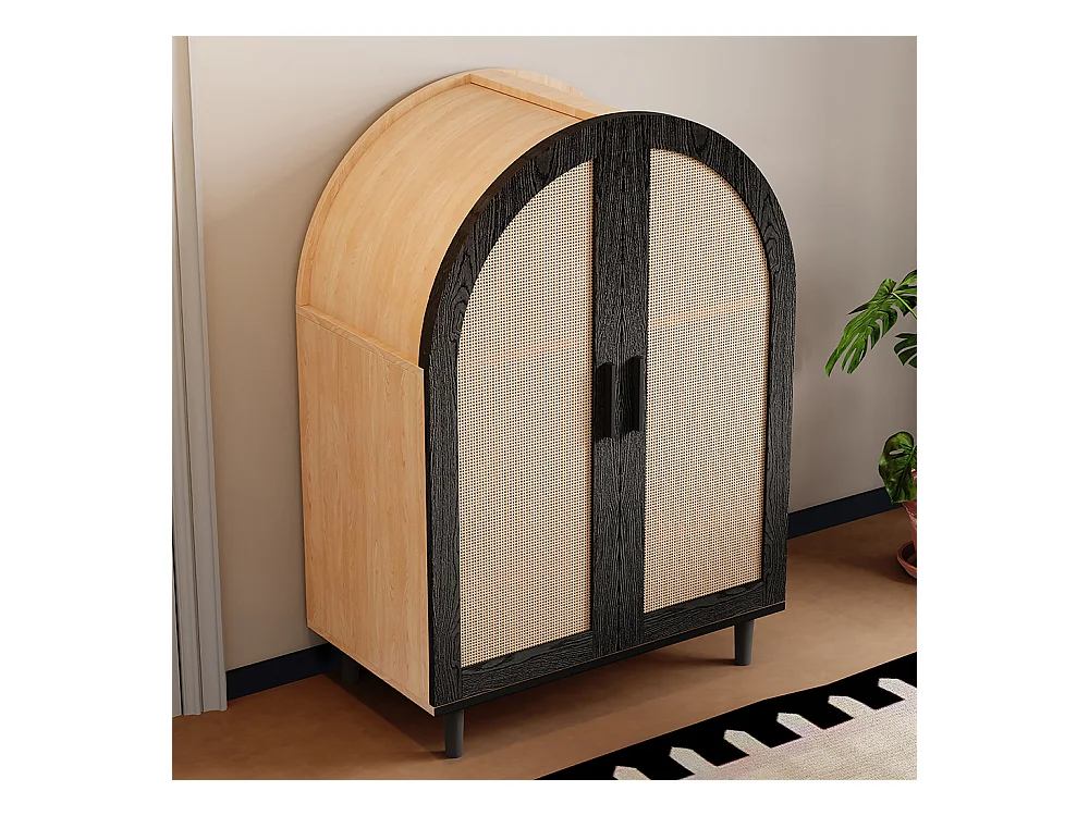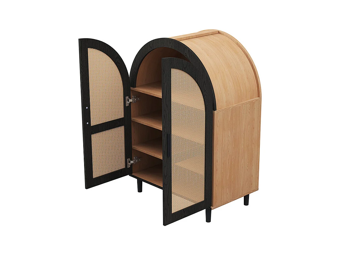 Meuble à chaussures élégant extérieur arrondi portes rotin trois étagères naturel