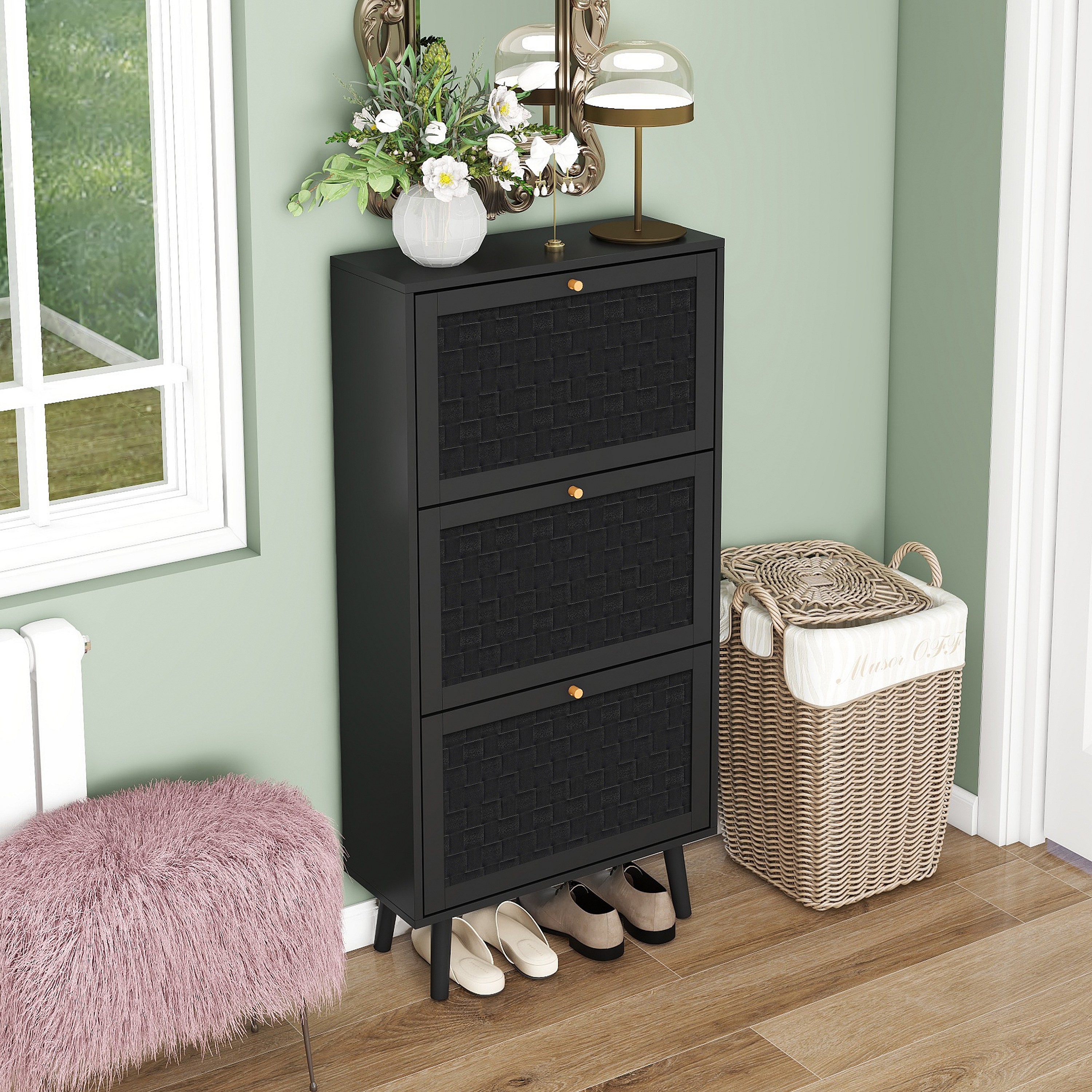 Meuble à chaussures noir 60x24x121 cm, 3 niveaux style bohème avec motif à rayures raffiné. Idéal pour entrée, couloir ou autres espaces