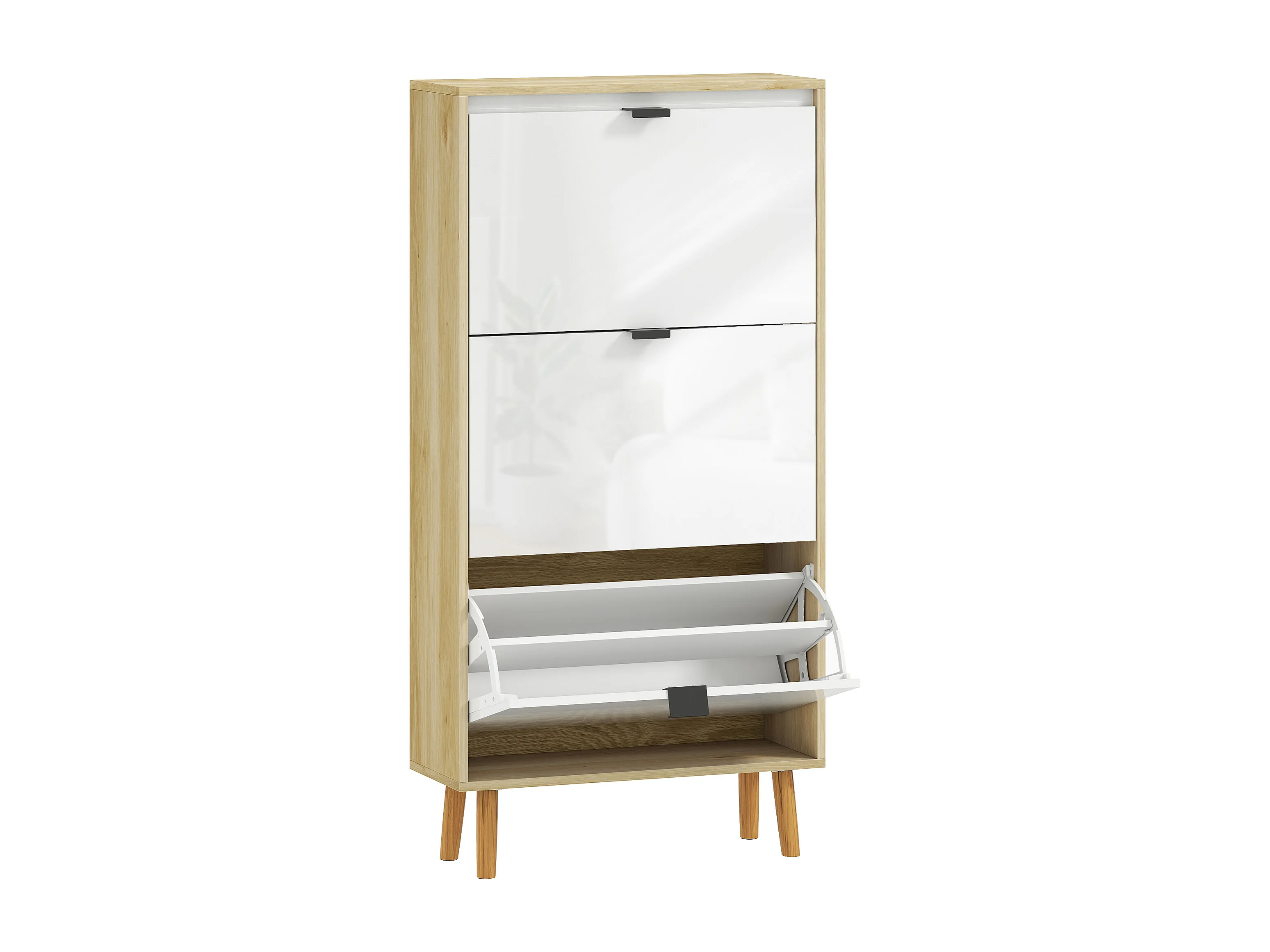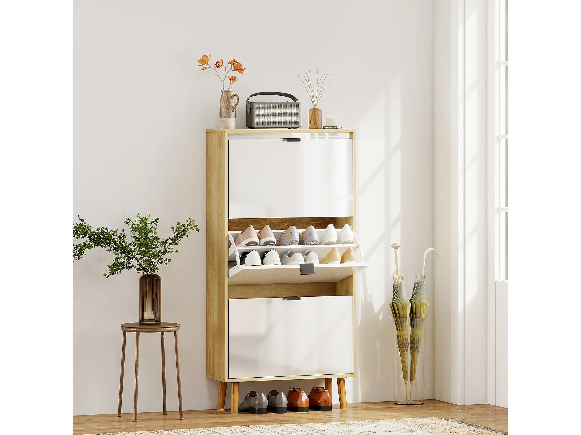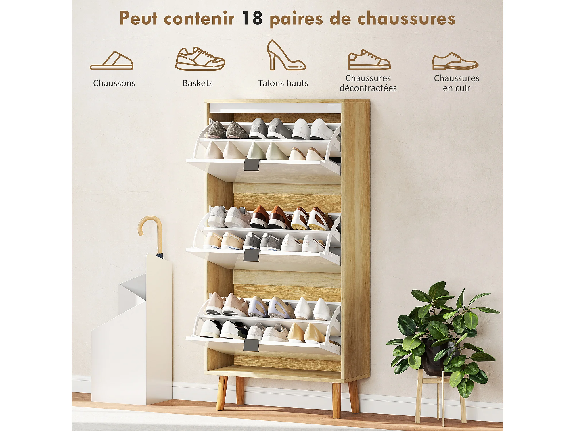 Meuble à chaussures style scandinave 3 portes étagères réglables piètement bois blanc effet bois clair
