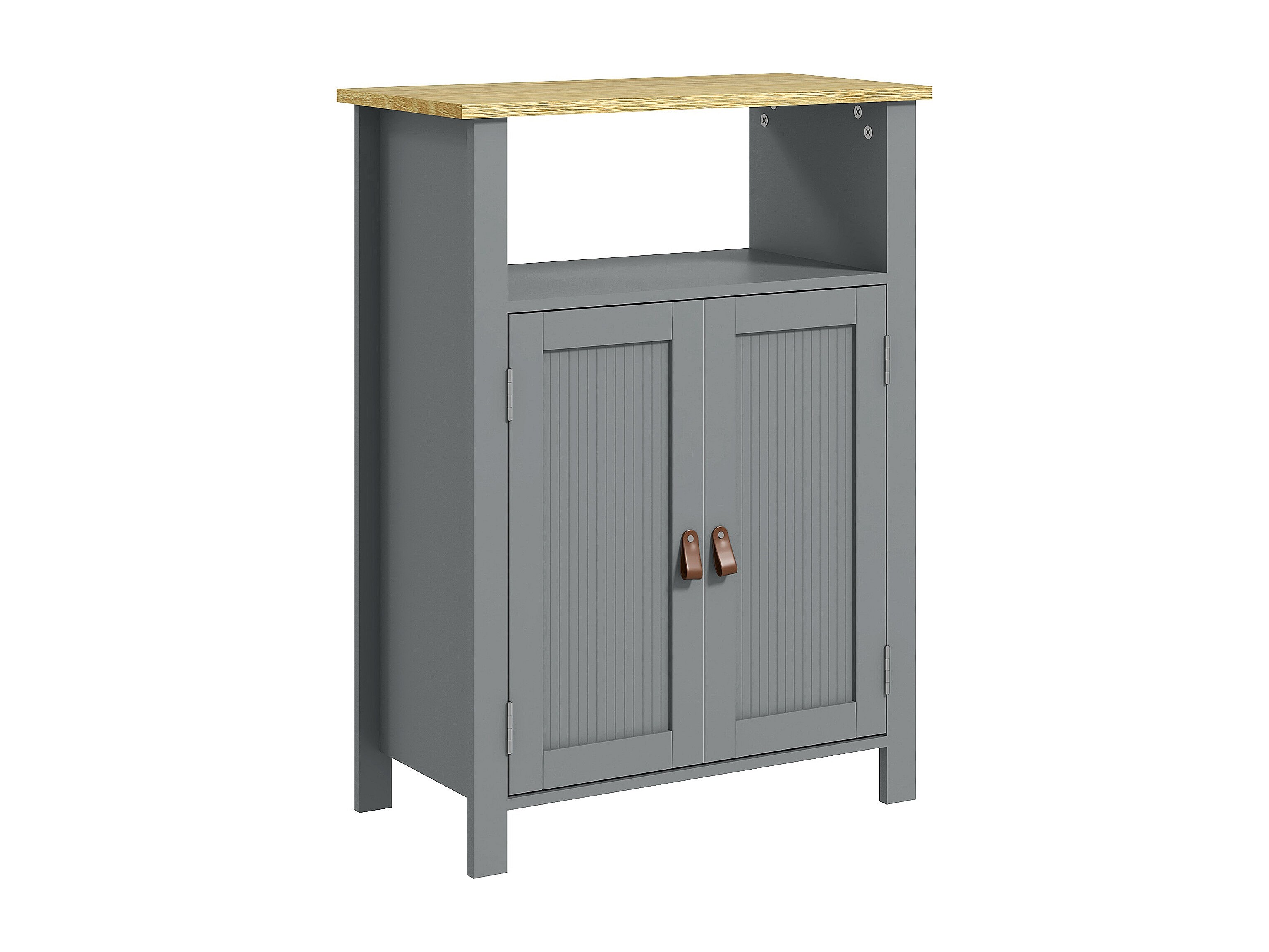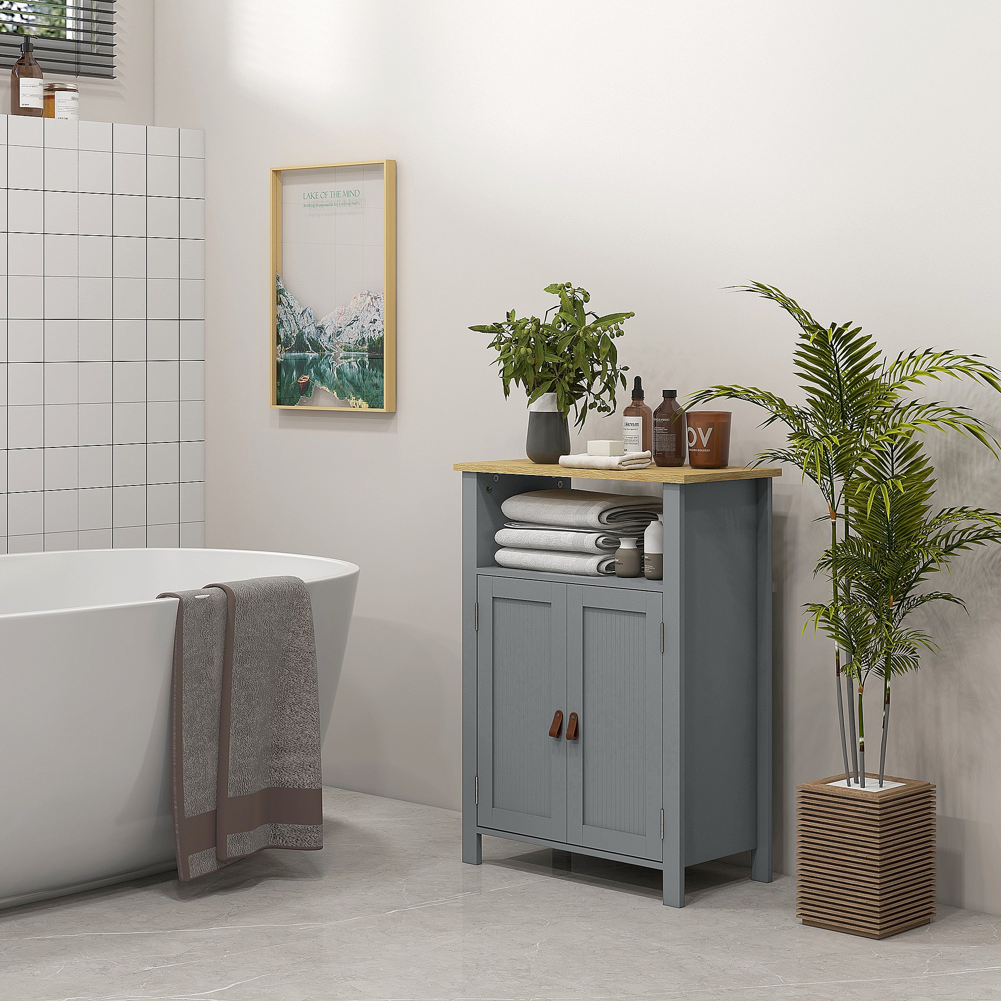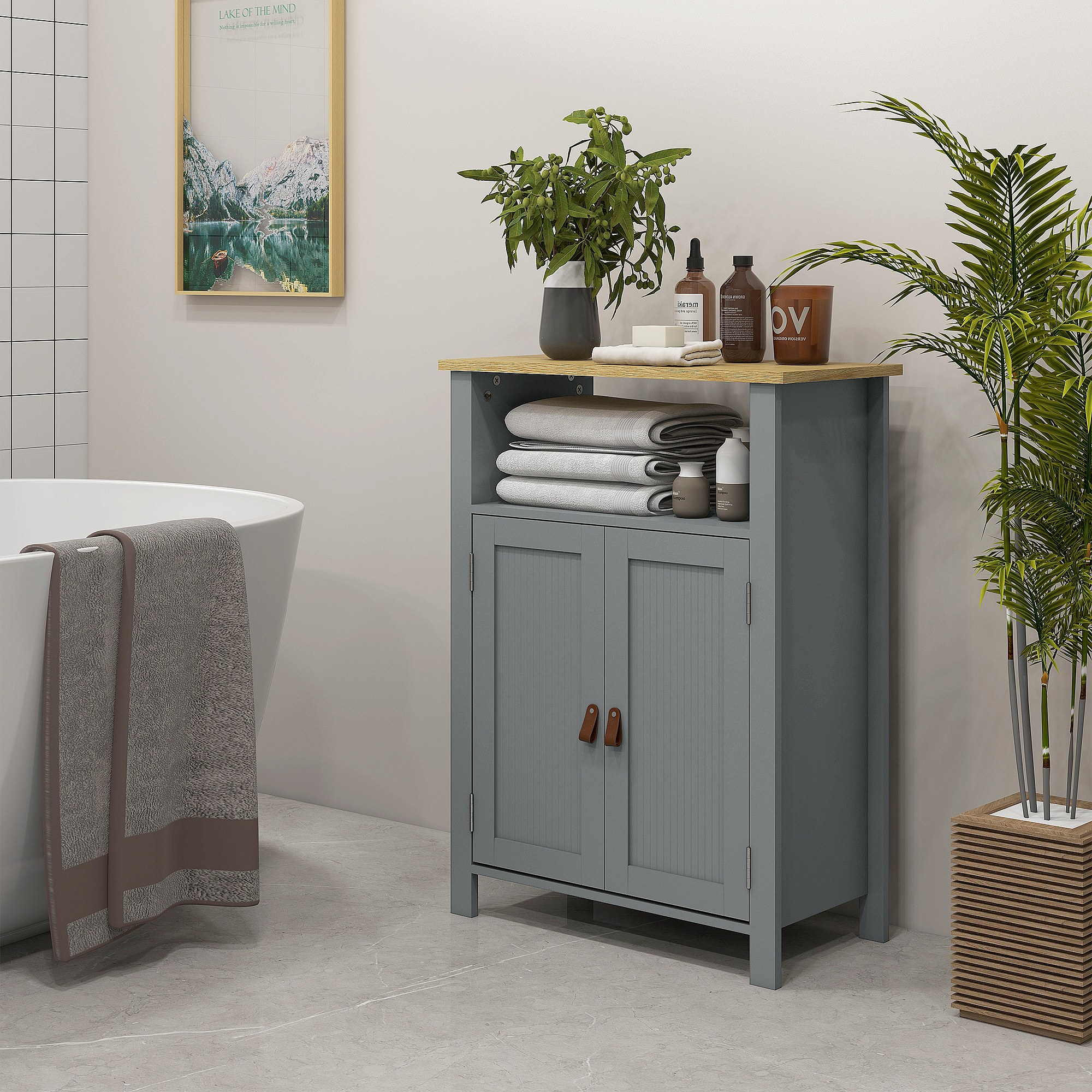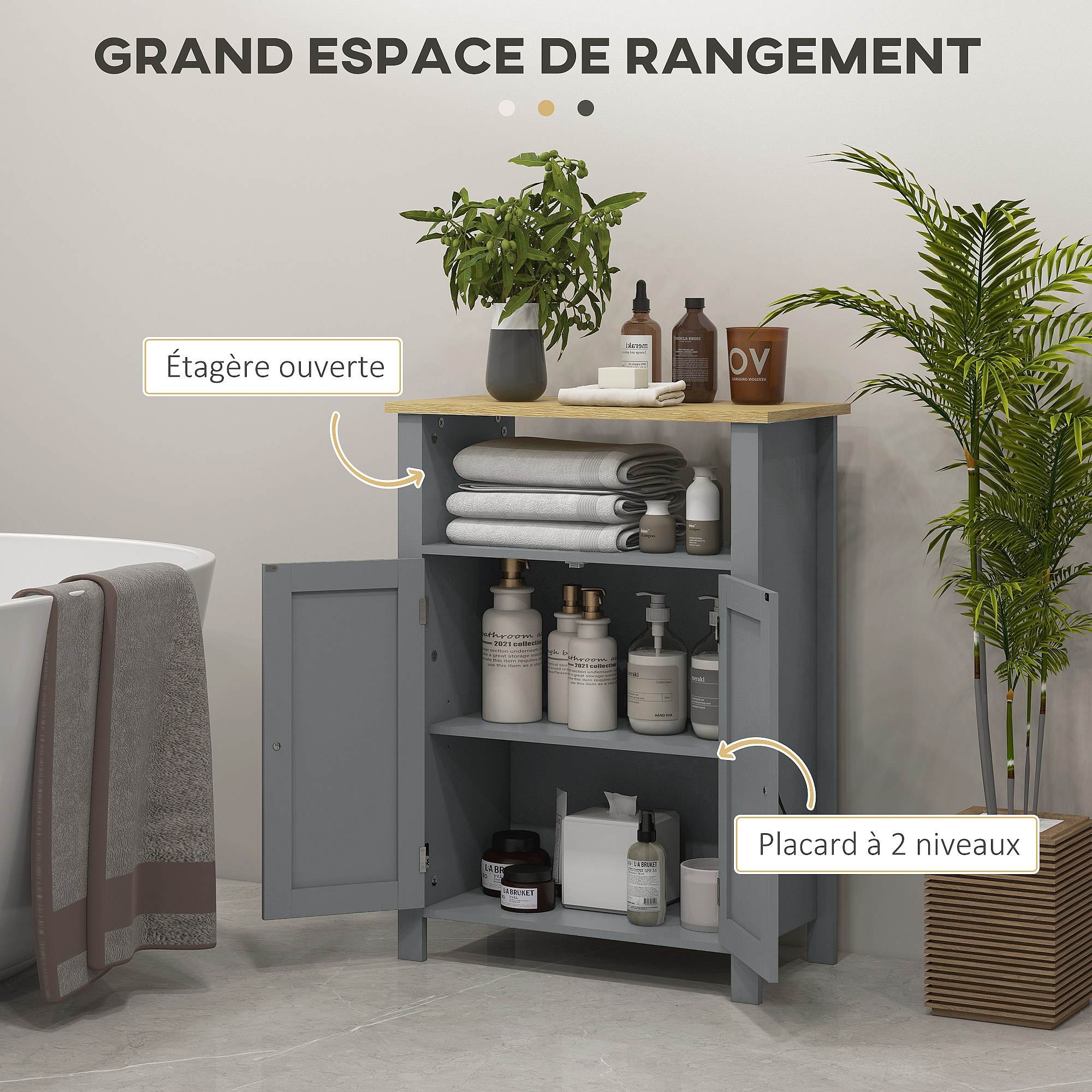 Meuble bas de salle de bain sur pied 2 portes étagère niche plateau aspect bois clair gris