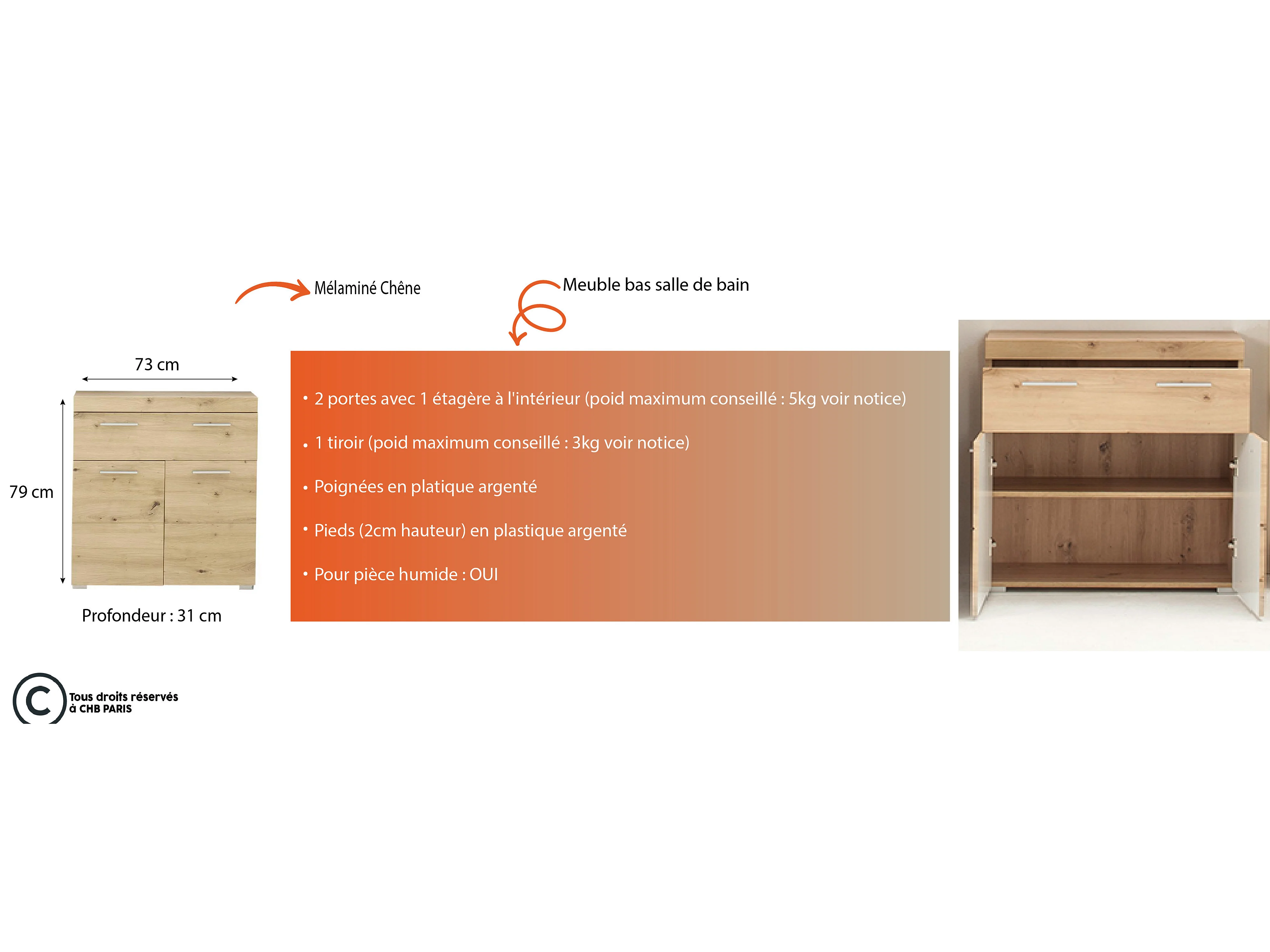 Meuble bas mélaminé chêne. L - H - P : 73 - 79 - 31 cm