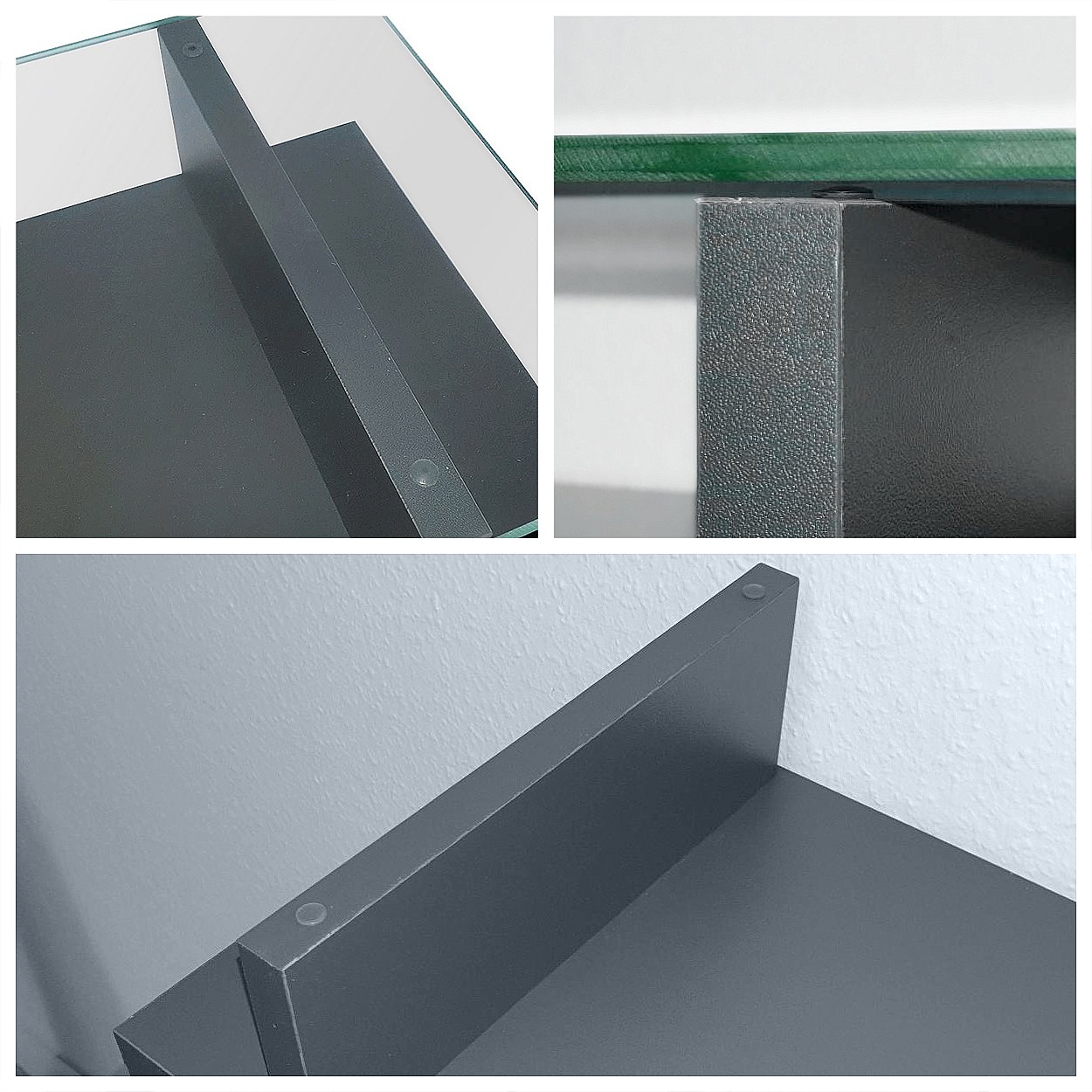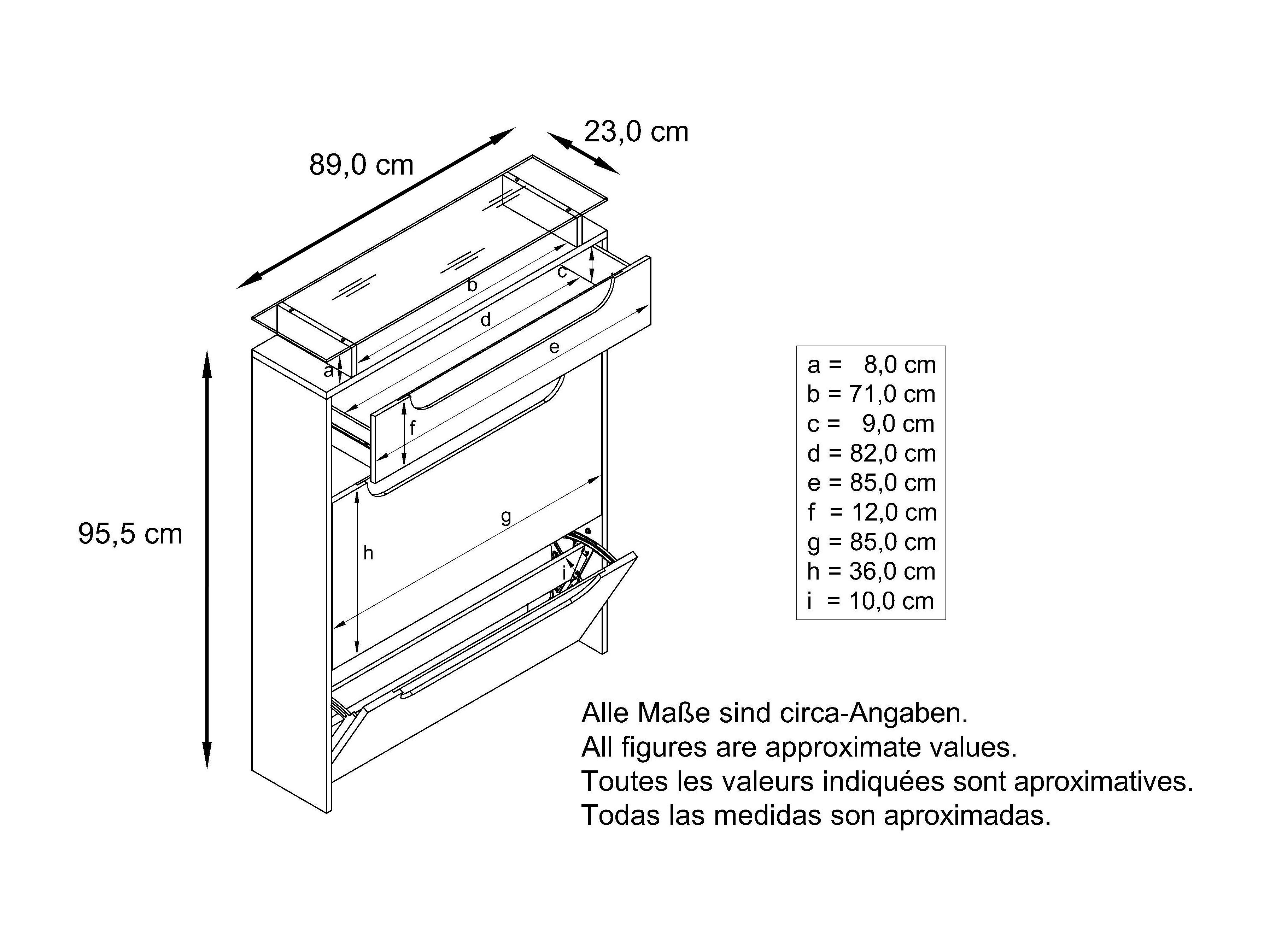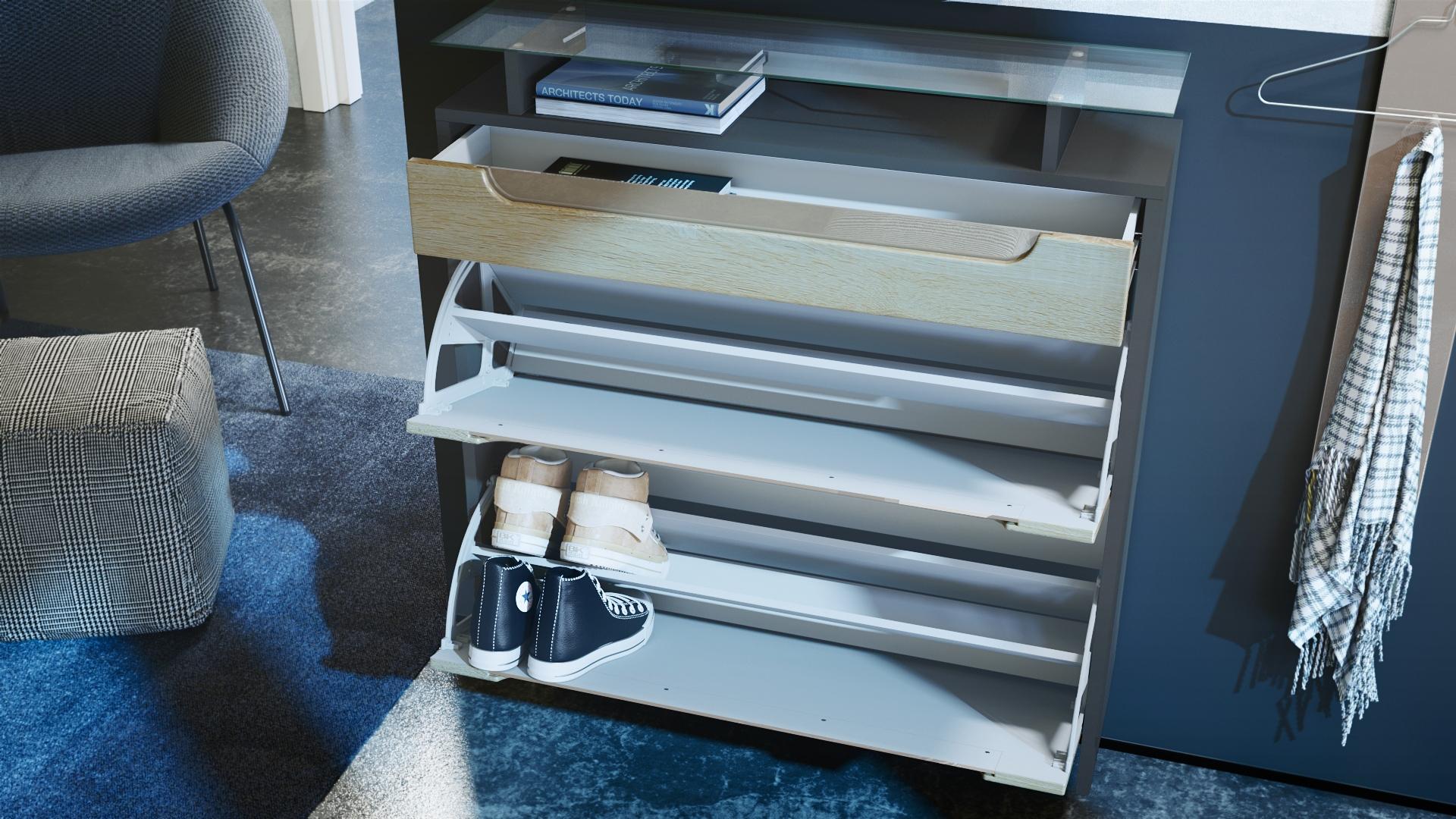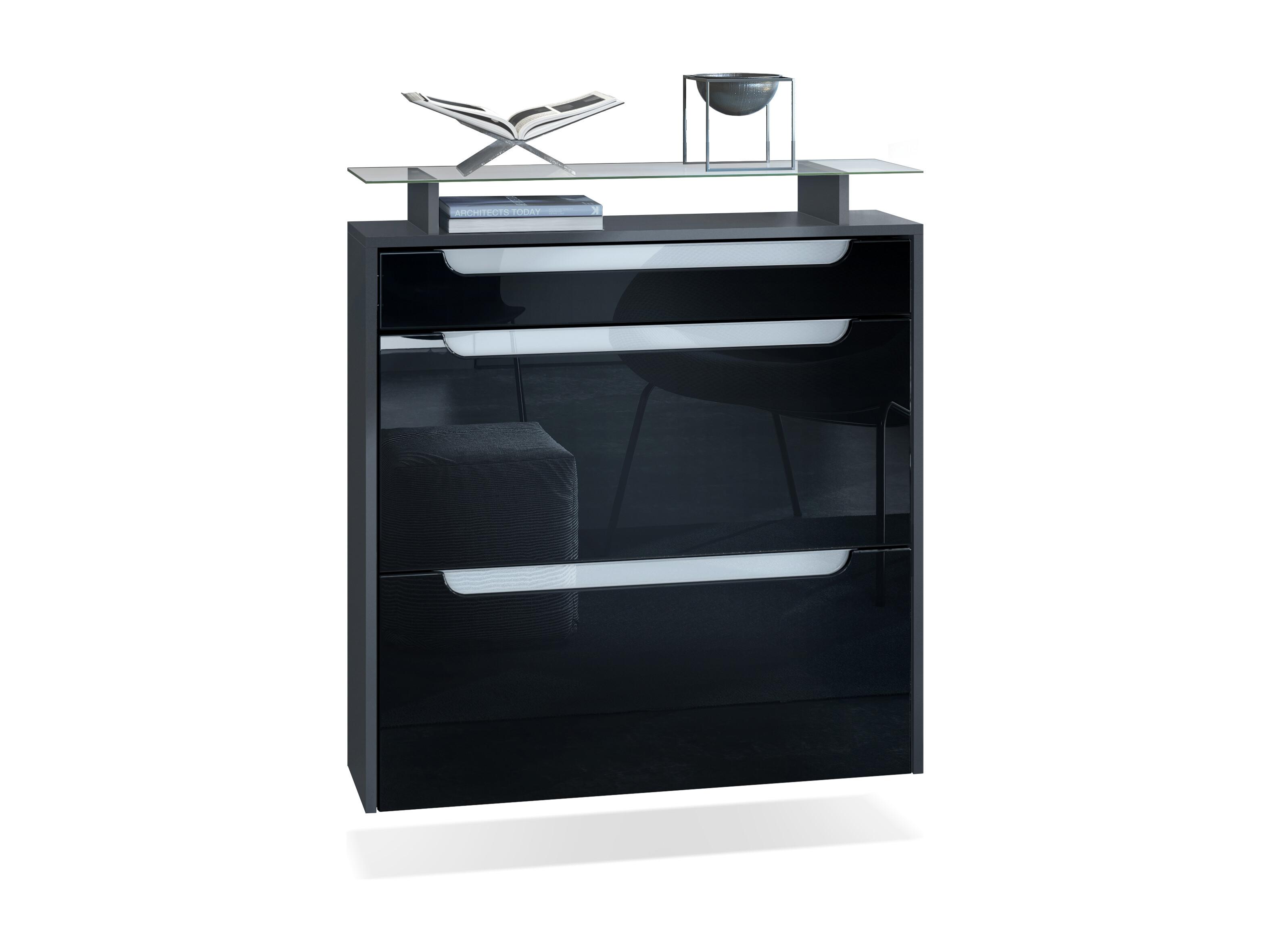 Meuble chaussures Annie pour 16 paires de chaussures avec clapets et tablette en verre, Anthracite mat/Noir brillant, poignées Blanc brillant (89x96x23 cm)