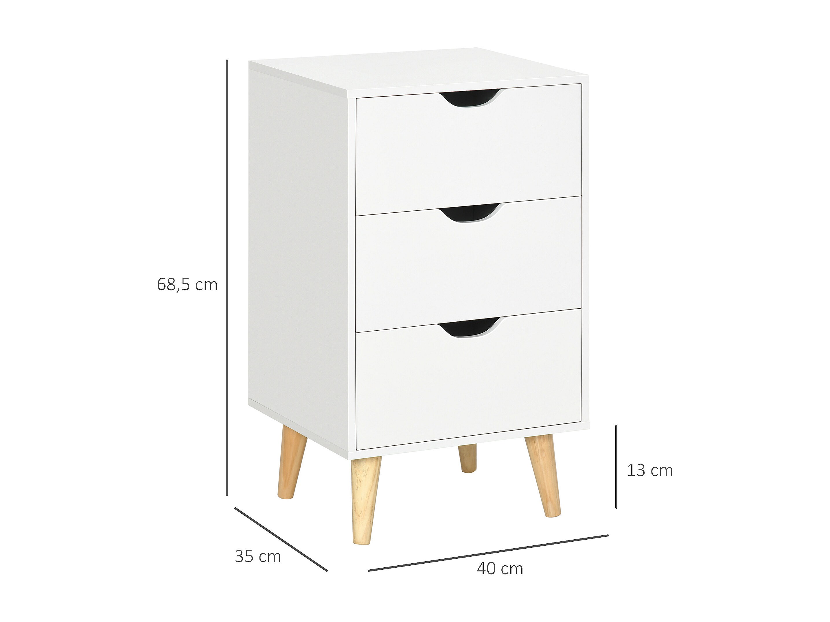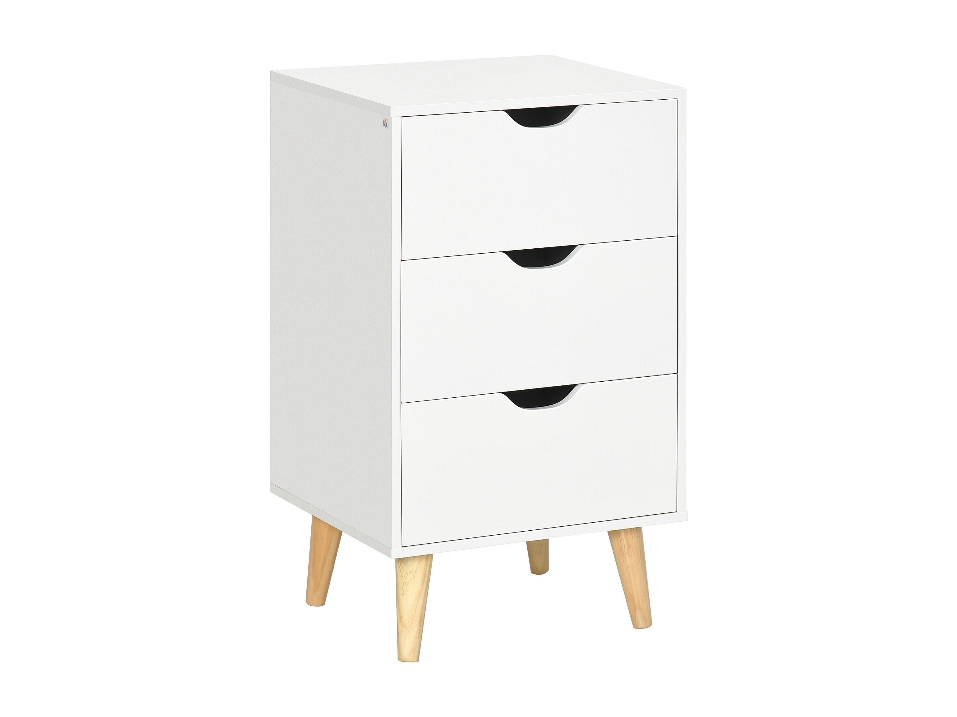 Meuble de rangement chiffonnier 3 tiroirs design scandinave piètement effilé incliné bois pin panneaux blanc