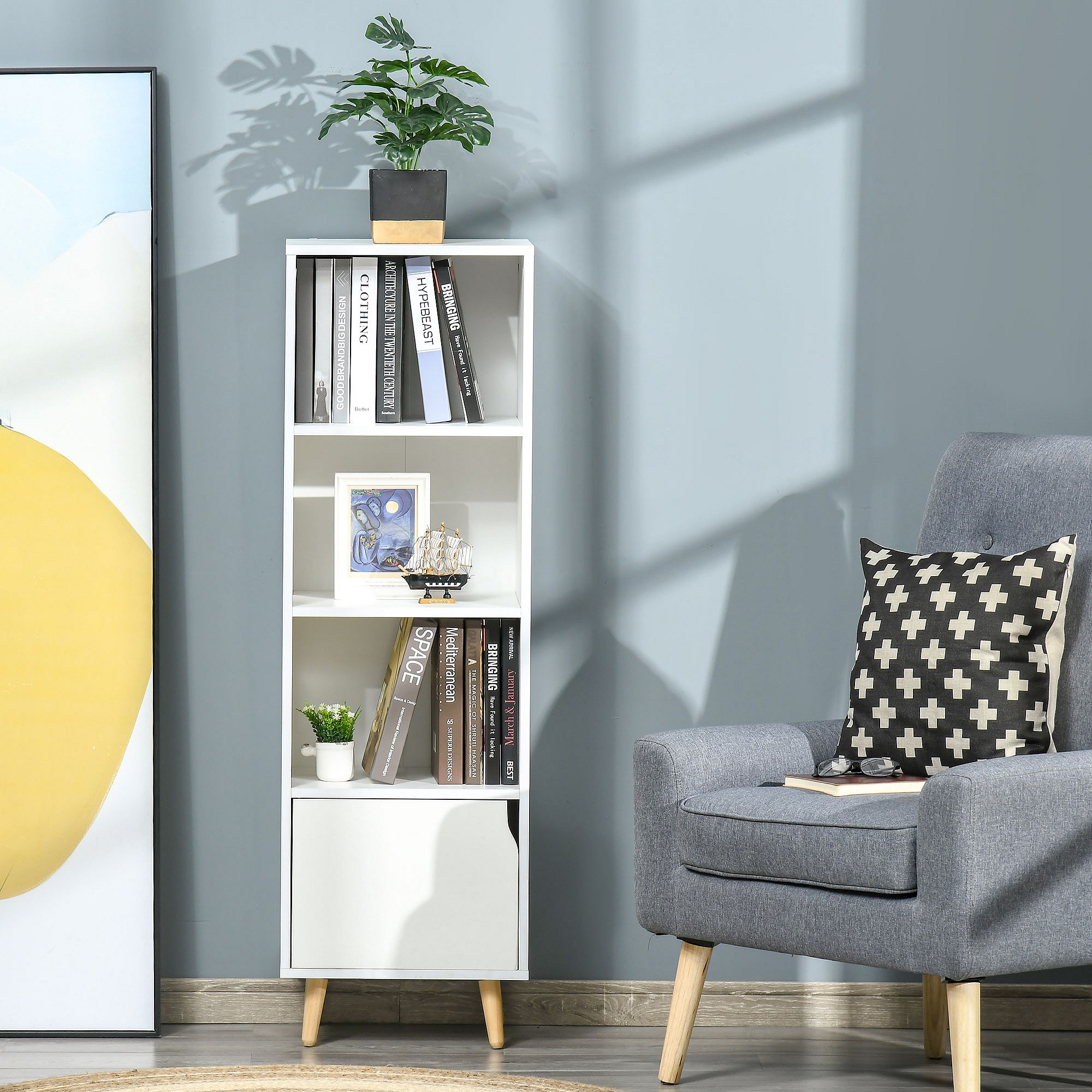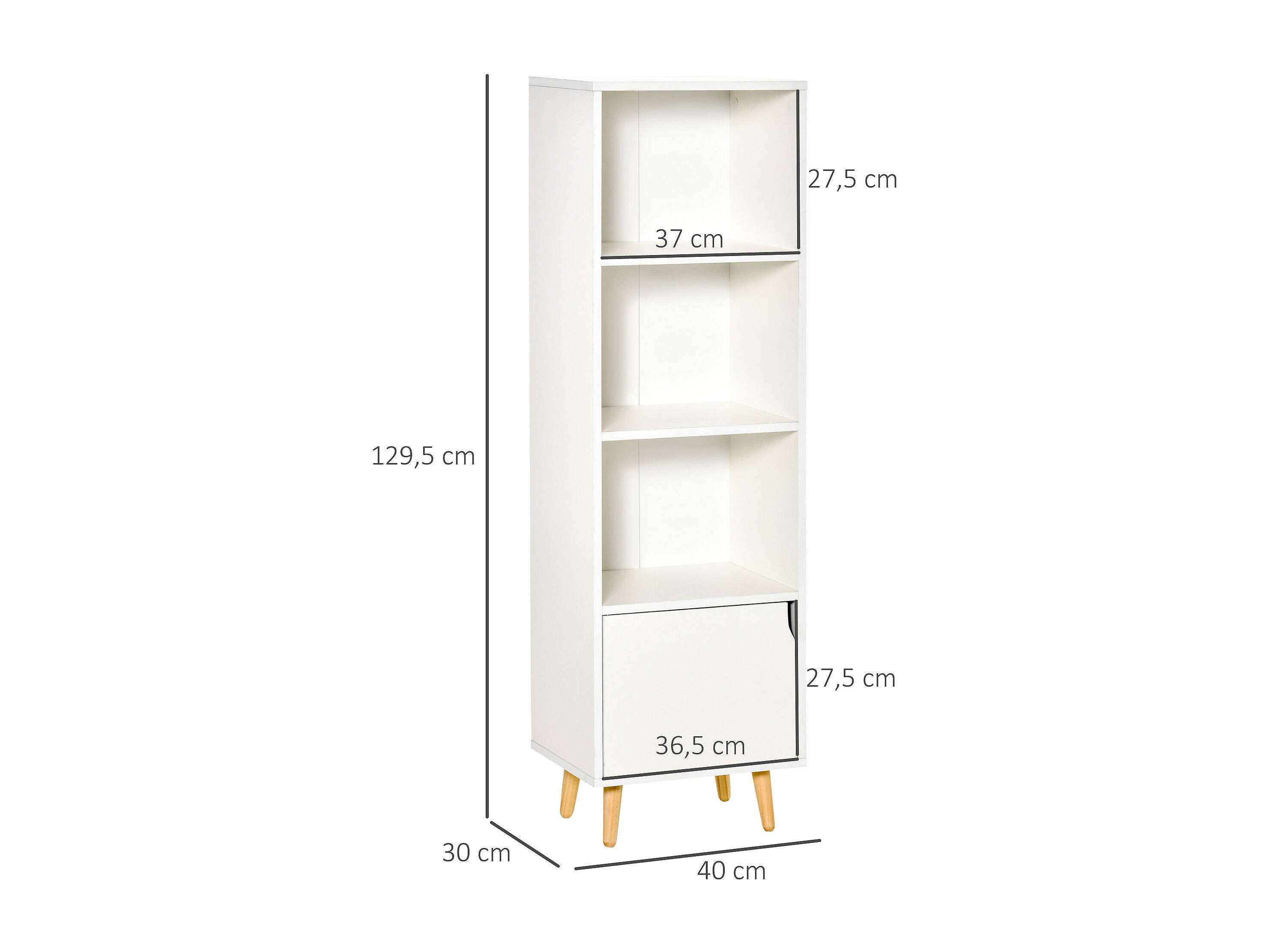 Bibliothèque scandinave dim. 80L x 23,5l x 123H cm 5 niches placard 2 portes pieds effilés inclinés bois massif panneaux particules blanc