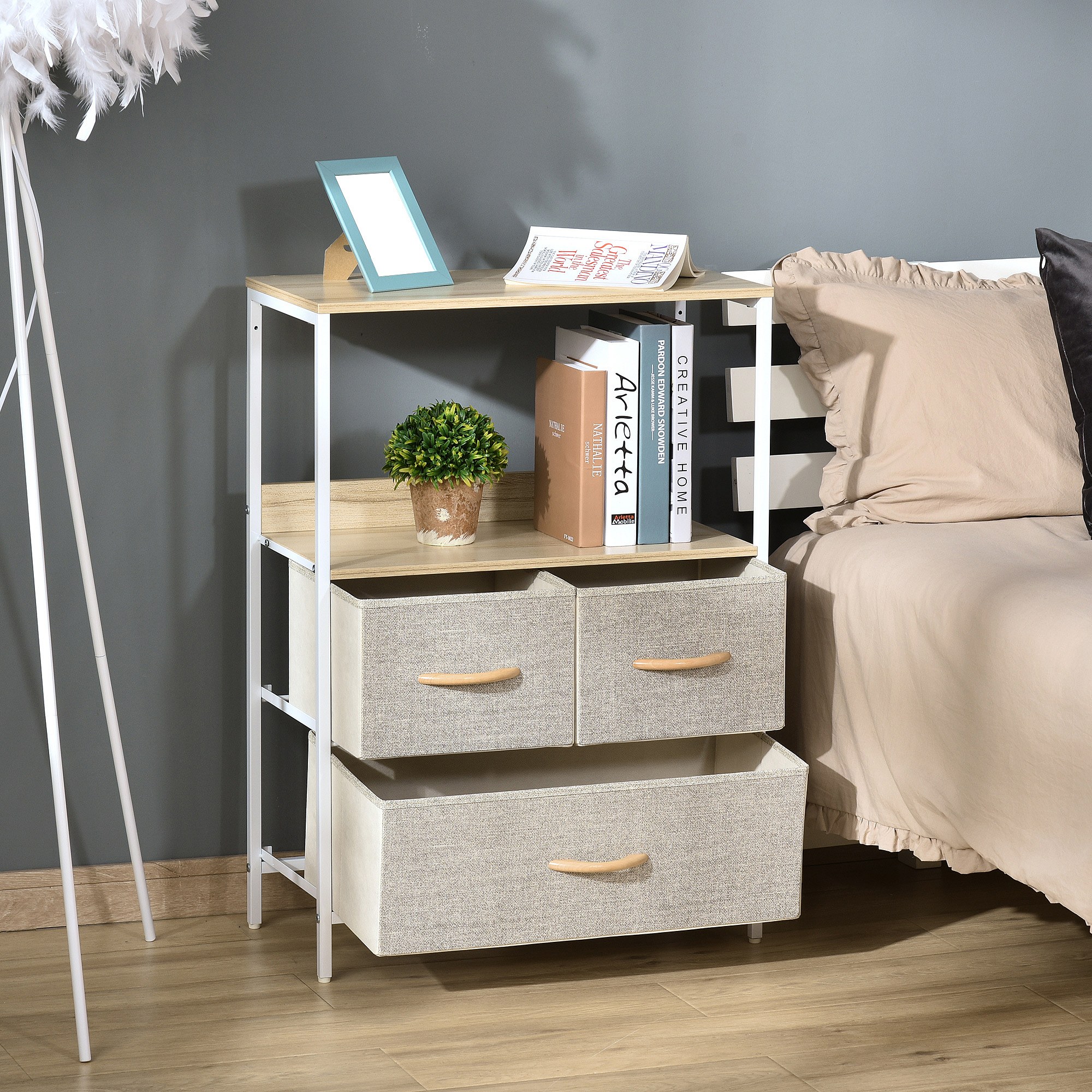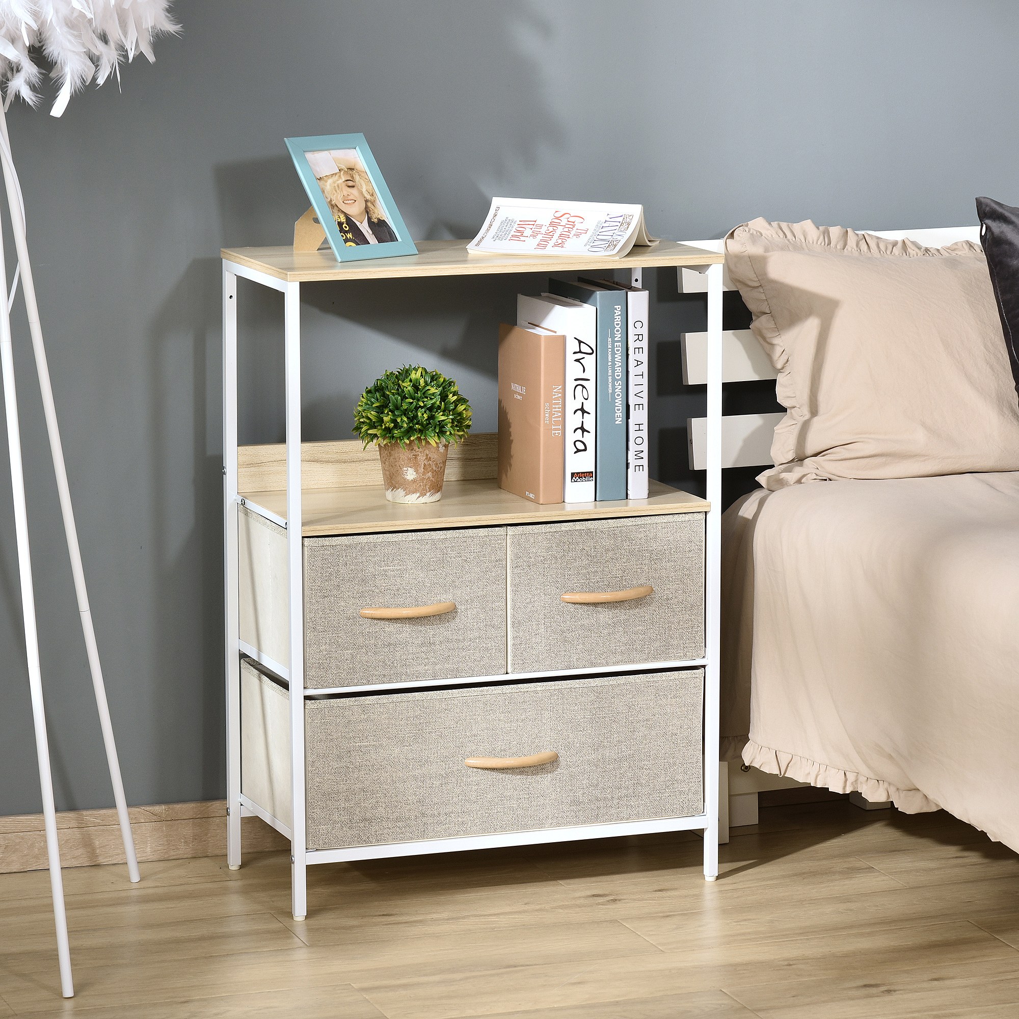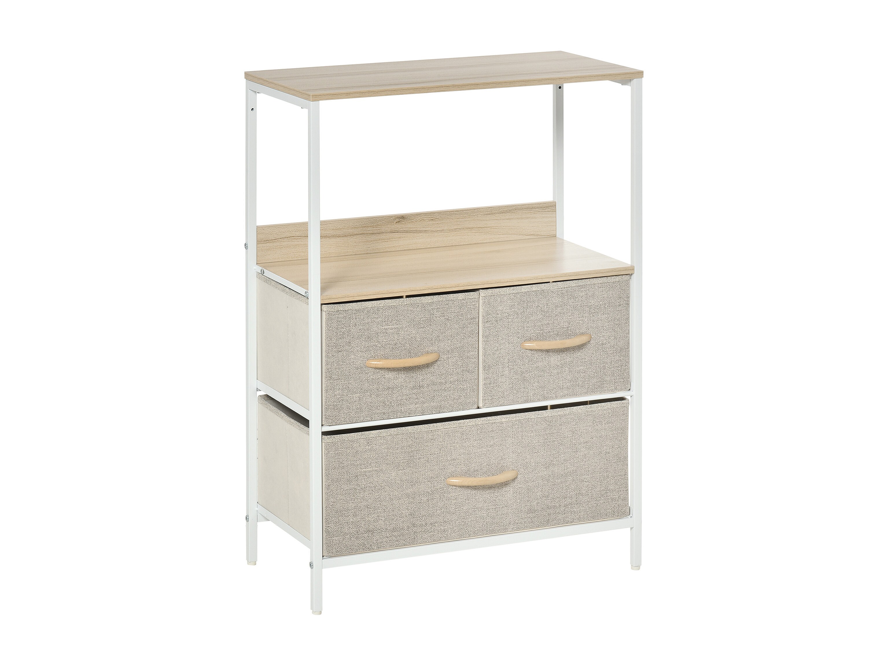 Meuble de rangement commode 3 tiroirs étagère plateau acier blanc MDF bois clair non tissé gris clair
