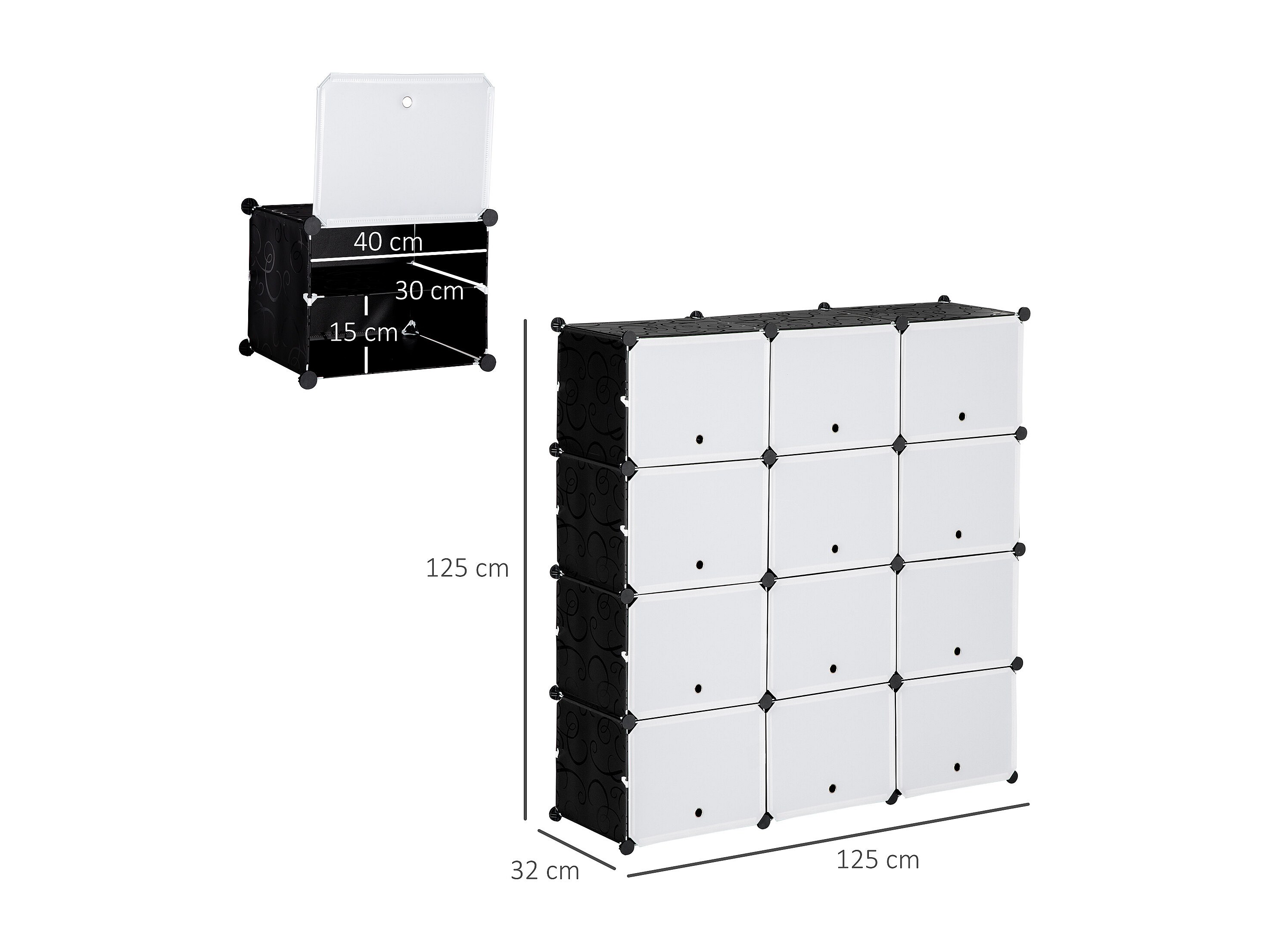 Meuble de rangement - meuble à chaussures modulable 12 casiers avec portes et étagères - dim. 125L x 32l x 125H cm - PP noir blanc