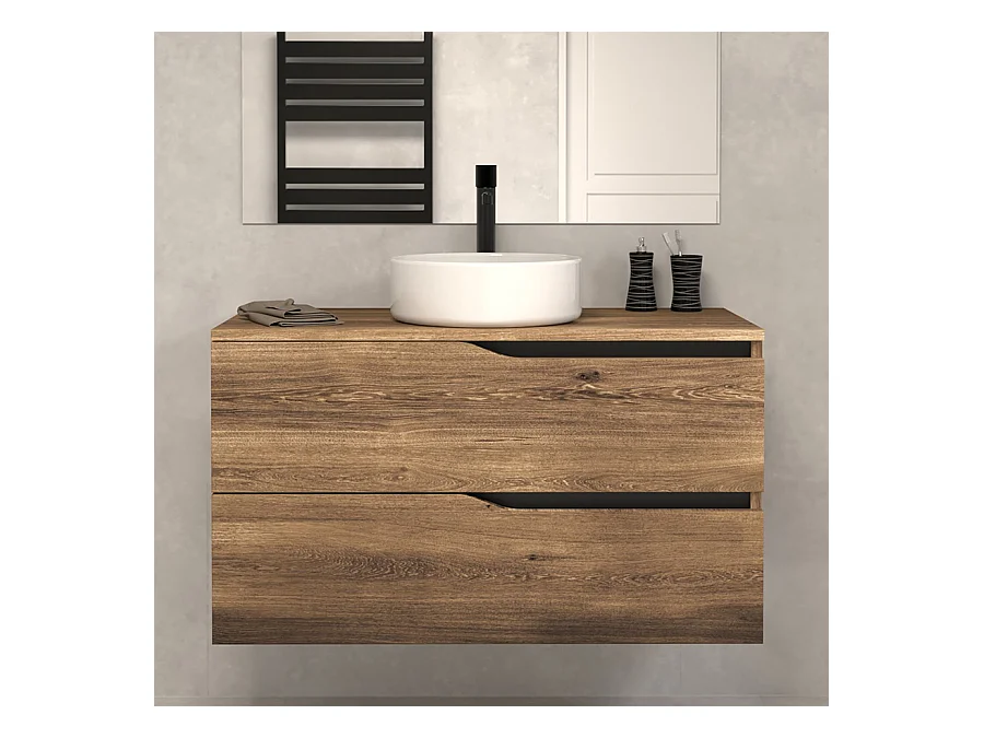 Meuble de salle de bain 100 avec plateau et vasque à poser - sans miroir - 2 tiroirs - tabaco (bois foncé) - LUNA
