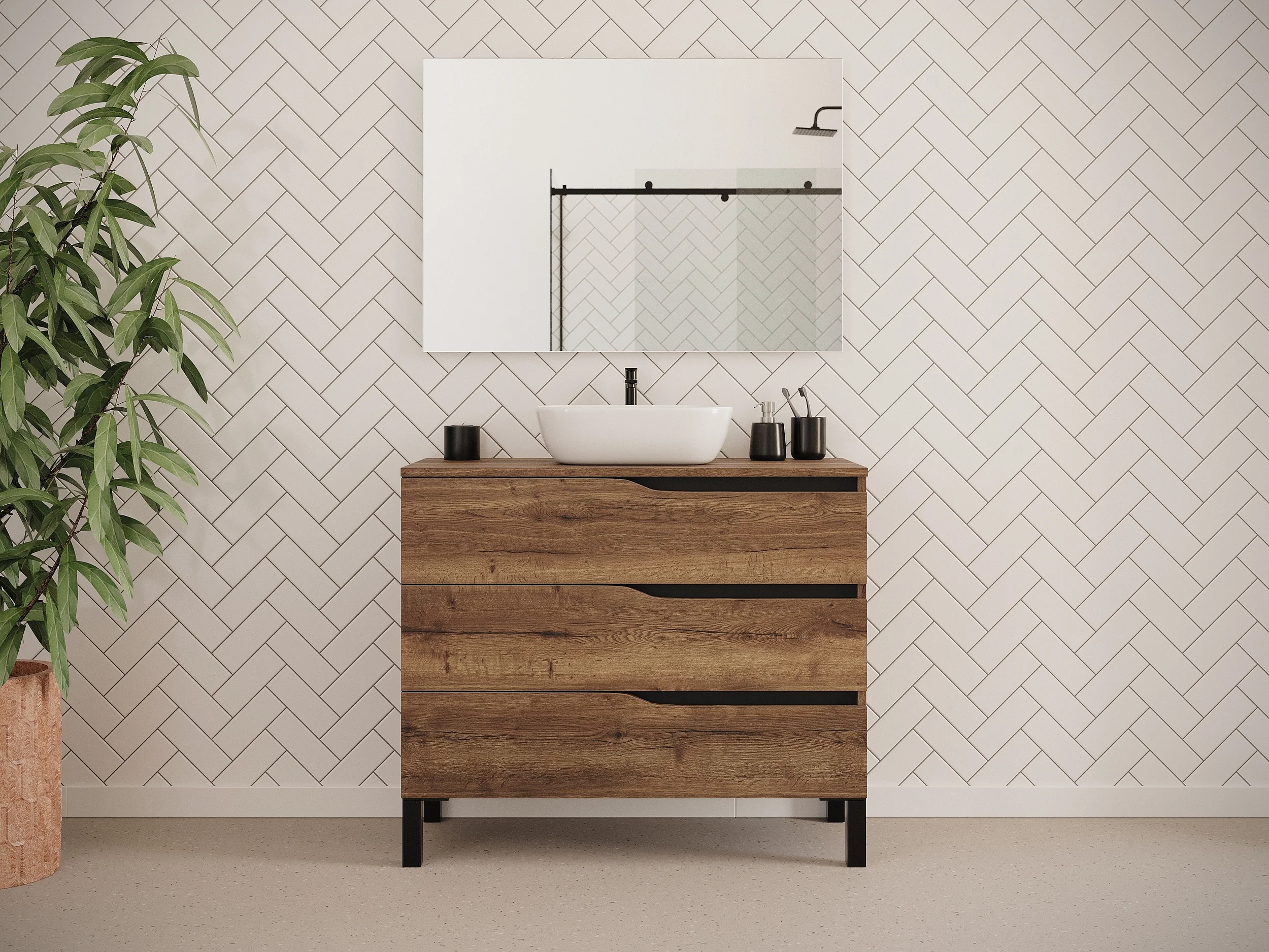 Meuble de salle de bain 100cm avec plateau et vasque à poser zeus - 3 tiroirs - tabaco (chêne foncé) - MATA