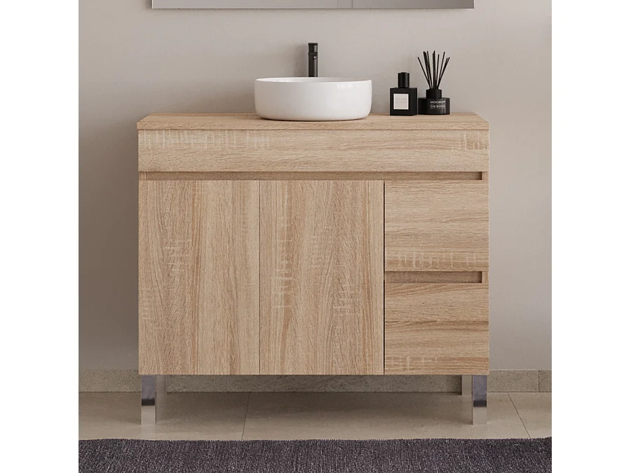 Meuble de salle de bain 100cm sur pieds avec plateau et une cuve à poser ronde - portes et tiroirs - cambrian (chêne clair) - HARO