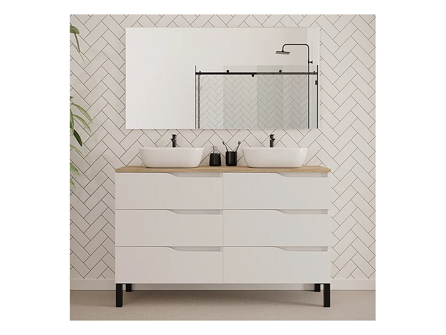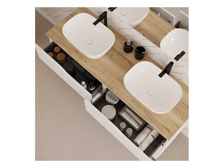 Meuble de salle de bain 120cm avec plateau miel et deux vasques à poser zeus - 6 tiroirs - blanc - MATA