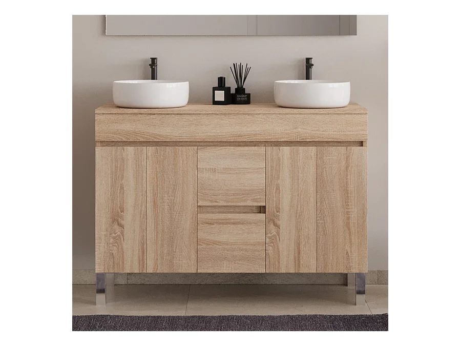 Meuble de salle de bain 120cm sur pieds avec plateau et deux cuves à poser rondes - sans miroir - portes et tiroirs - cambrian (chêne clair) - HARO