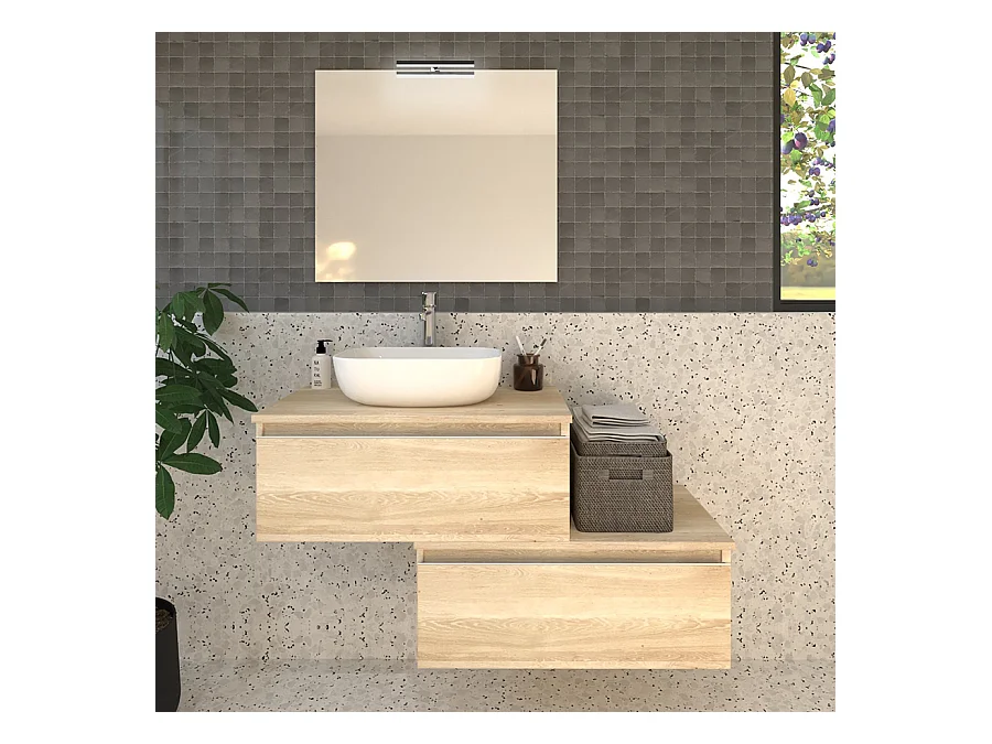 Meuble de salle de bain 2 tiroirs avec vasque à poser arrondie PENA et miroir avec applique - Bambou (chêne clair) - 120cm