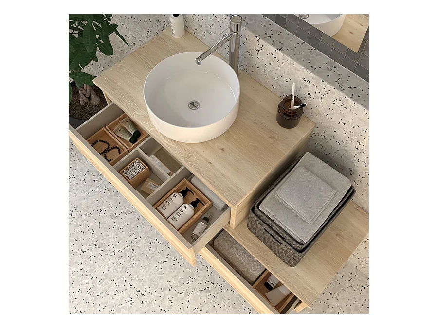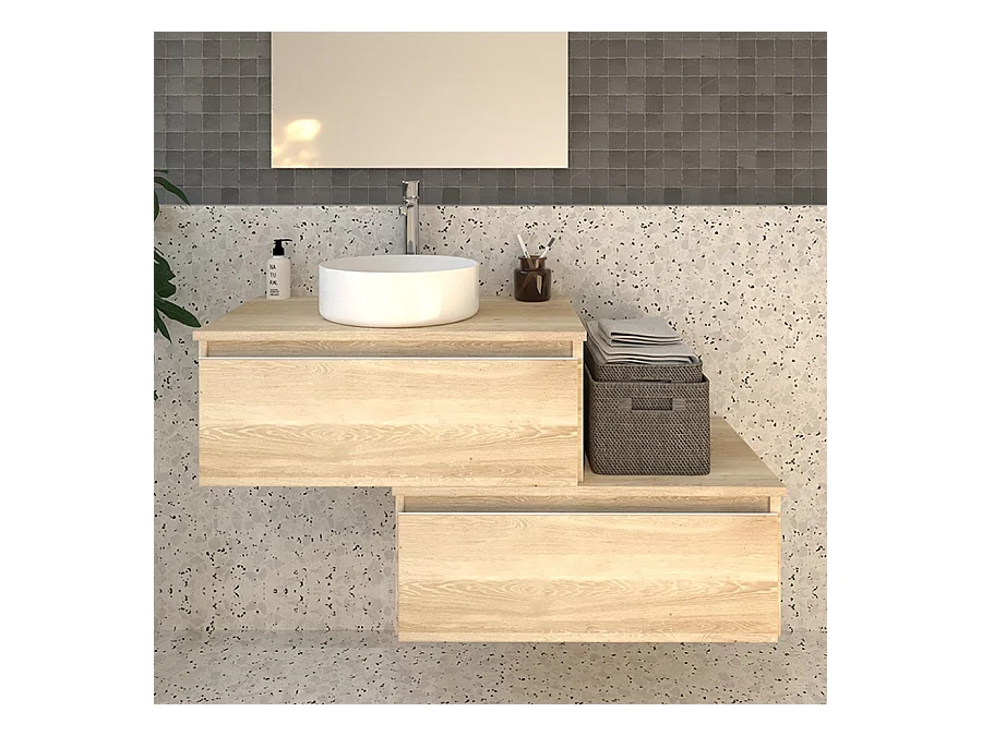 Meuble de salle de bain 2 tiroirs avec vasque à poser ronde PENA et miroir avec applique - Bambou (chêne clair) - 120cm