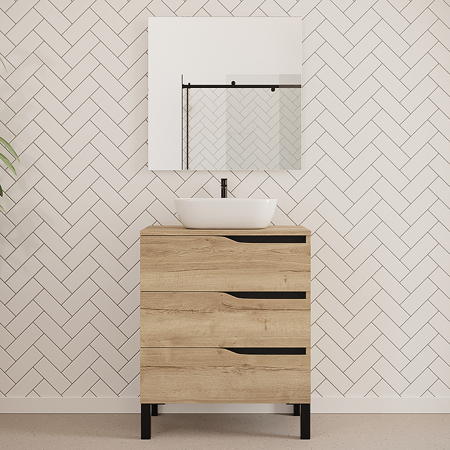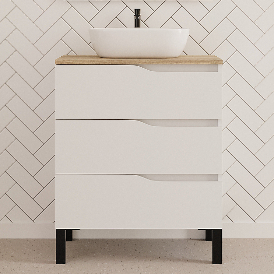 Meuble de salle de bain 80cm avec plateau miel et vasque à poser zeus - 3 tiroirs - sans miroir - blanc - MATA
