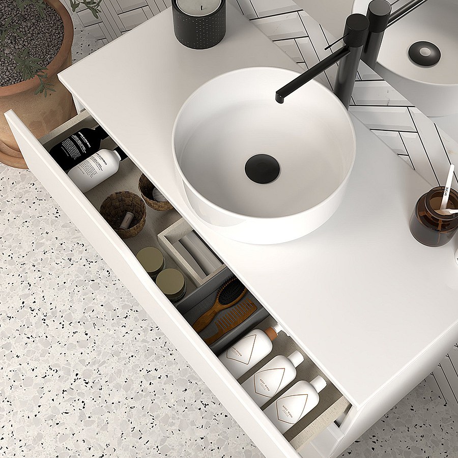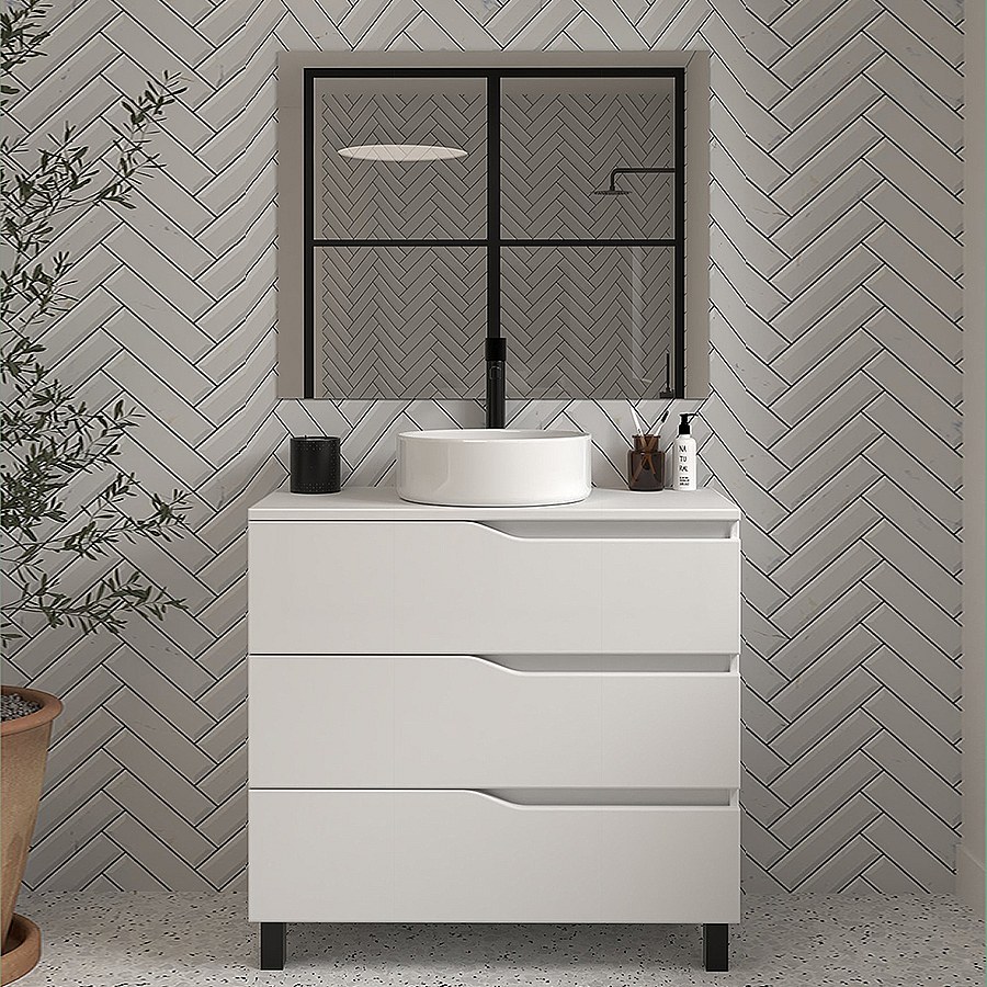 Meuble de salle de bain 90cm avec plateau et vasque à poser - 3 tiroirs - blanc - MATA