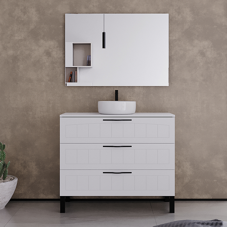 Meuble de salle de bain 90cm avec plateau et vasque à poser ronde - 3 tiroirs - blanc - CALA