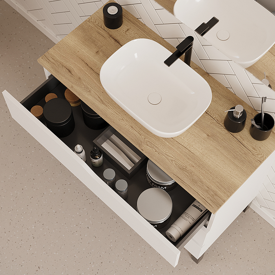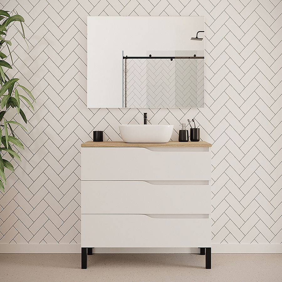 Meuble de salle de bain 90cm avec plateau miel et vasque à poser zeus - 3 tiroirs - blanc - MATA