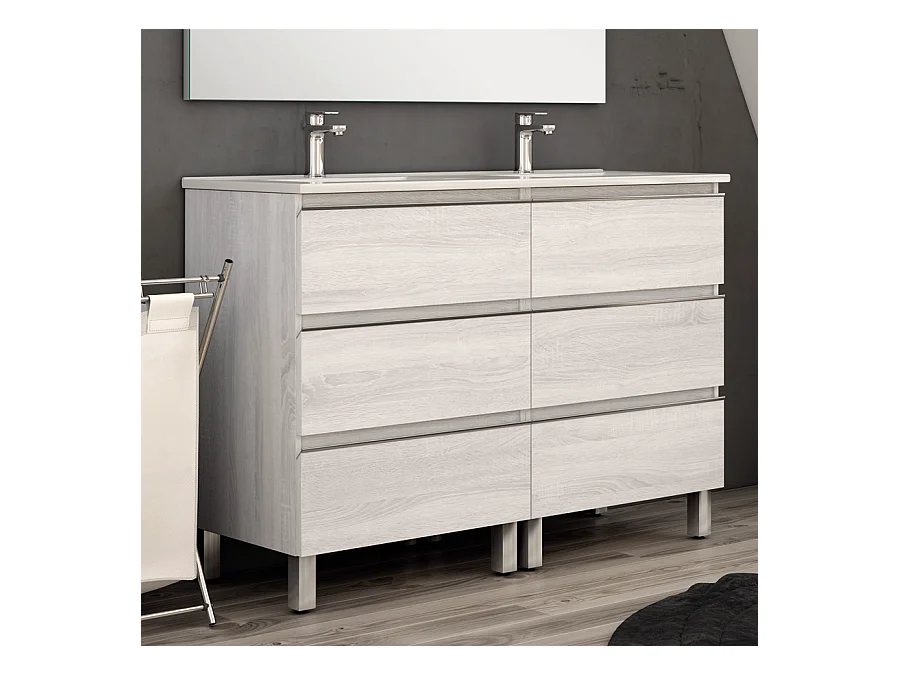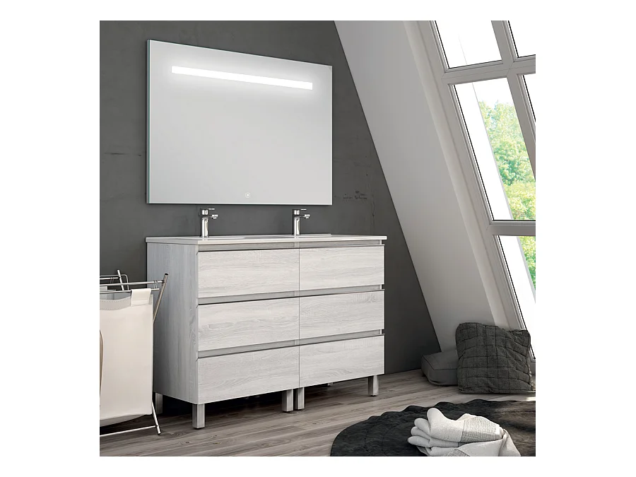 Meuble de salle de bain double vasque - 6 tiroirs - PALMA et miroir Led STAM - hibernian (bois blanchi) - 120cm