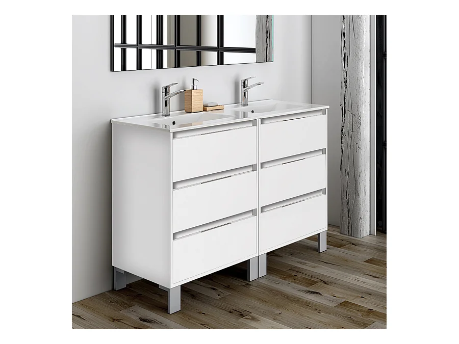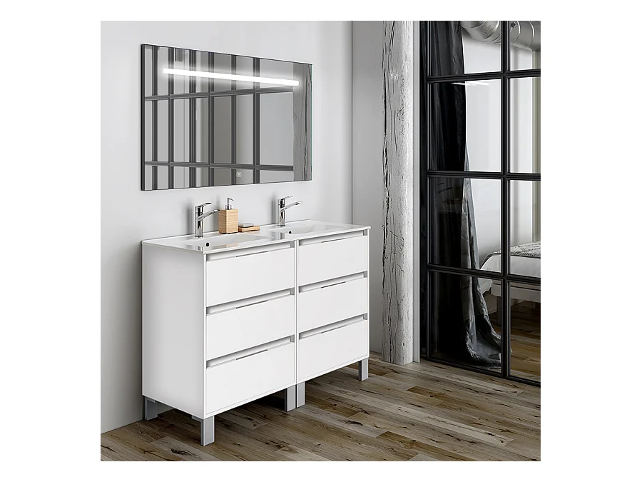 Meuble de salle de bain double vasque - 6 tiroirs - TIRIS 3C et miroir Led STAM - blanc - 120cm