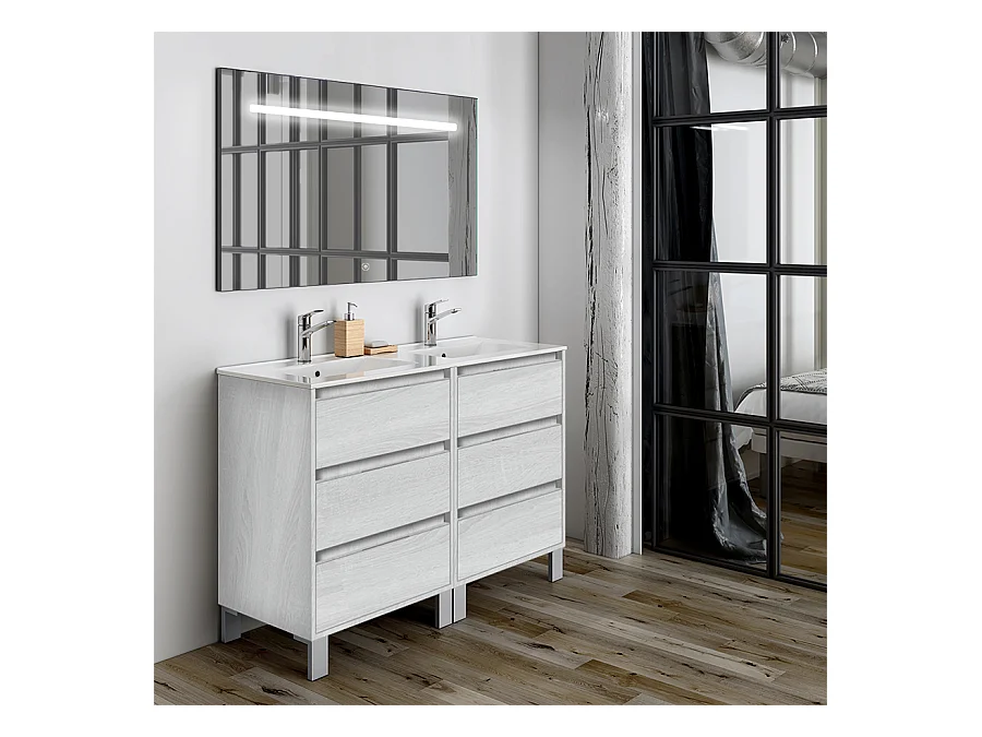 Meuble de salle de bain double vasque - 6 tiroirs - TIRIS 3C et miroir Led STAM - hibernian (bois blanchi) - 120cm