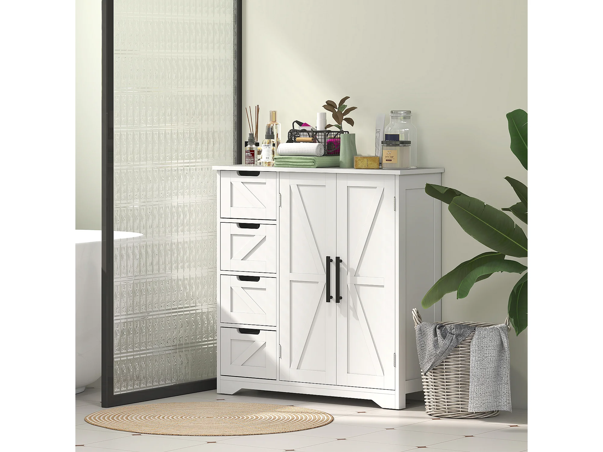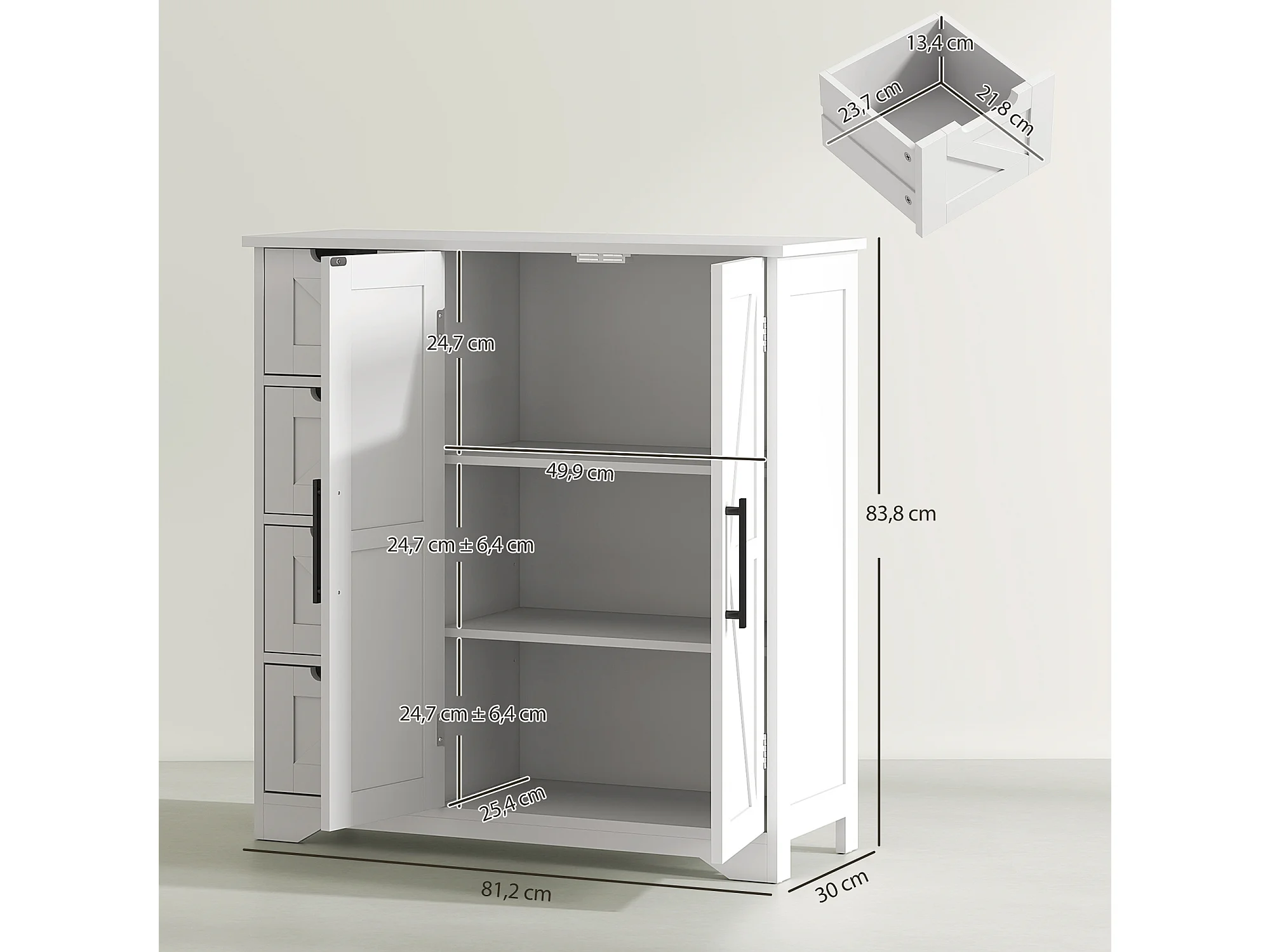 Meuble de Salle de Bain HOMCOM Blanc avec 4 Tiroirs et Placard - Style Ferme et Élégant
