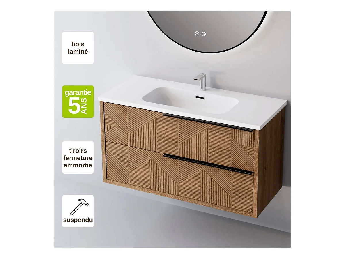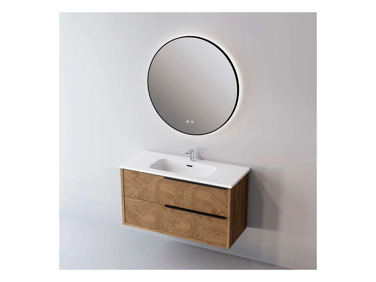 Meuble Salle de Bain REEL (81 cm x H54 x P45 cm), Plan Vasque Céramique WB, 2 Tiroirs Impression 3D Poignée Noir, Chêne Moyen
