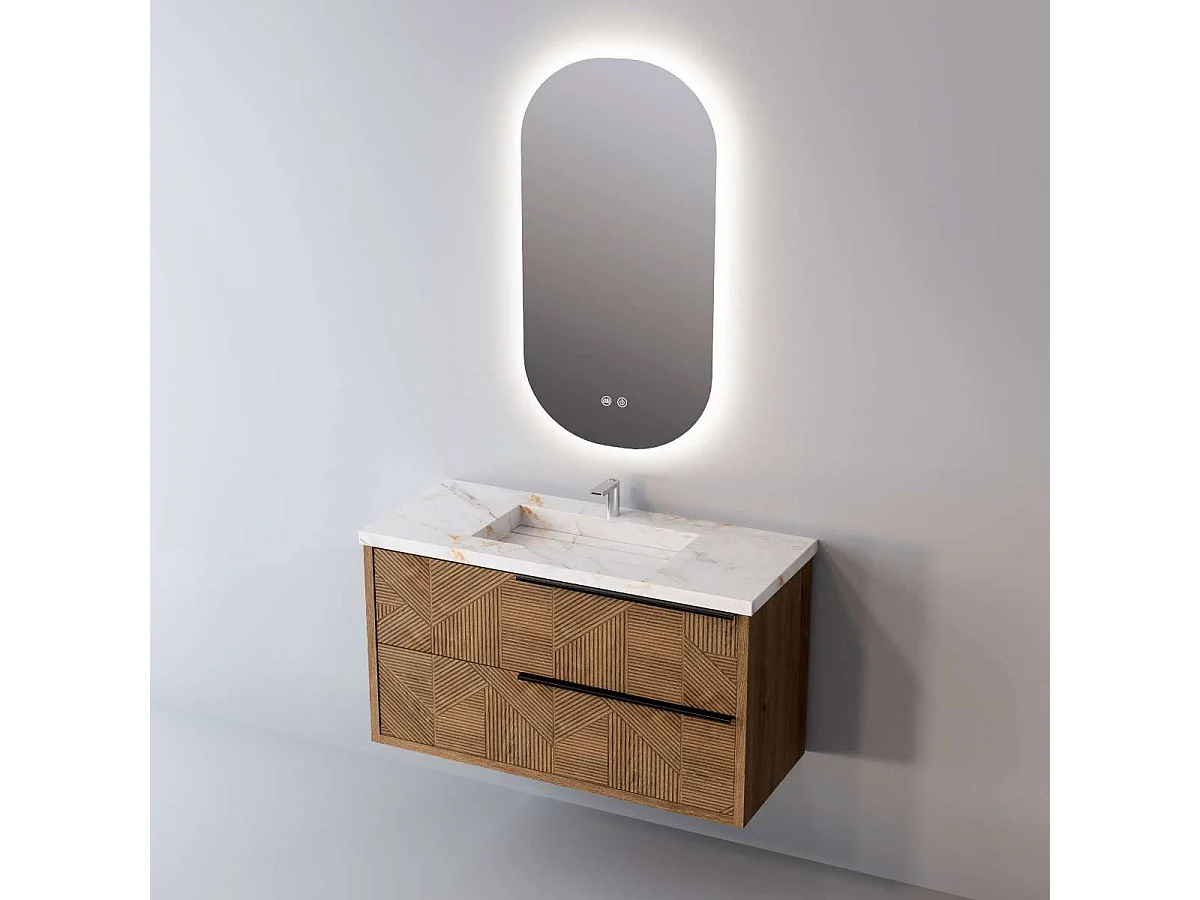Meuble Salle de Bain REEL (81 cm x H54 x P45 cm), Plan Vasque Grès Cérame BS, 2 Tiroirs Impression 3D Poignée Noir, Chêne Moyen