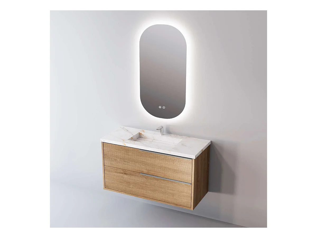 Meuble Salle de Bain LISTELLO (61 cm x H54 x P45 cm), Plan Vasque Grès Cérame BS, 2 Tiroirs Impression 3D Poignée Inox Satiné, Chêne Naturel
