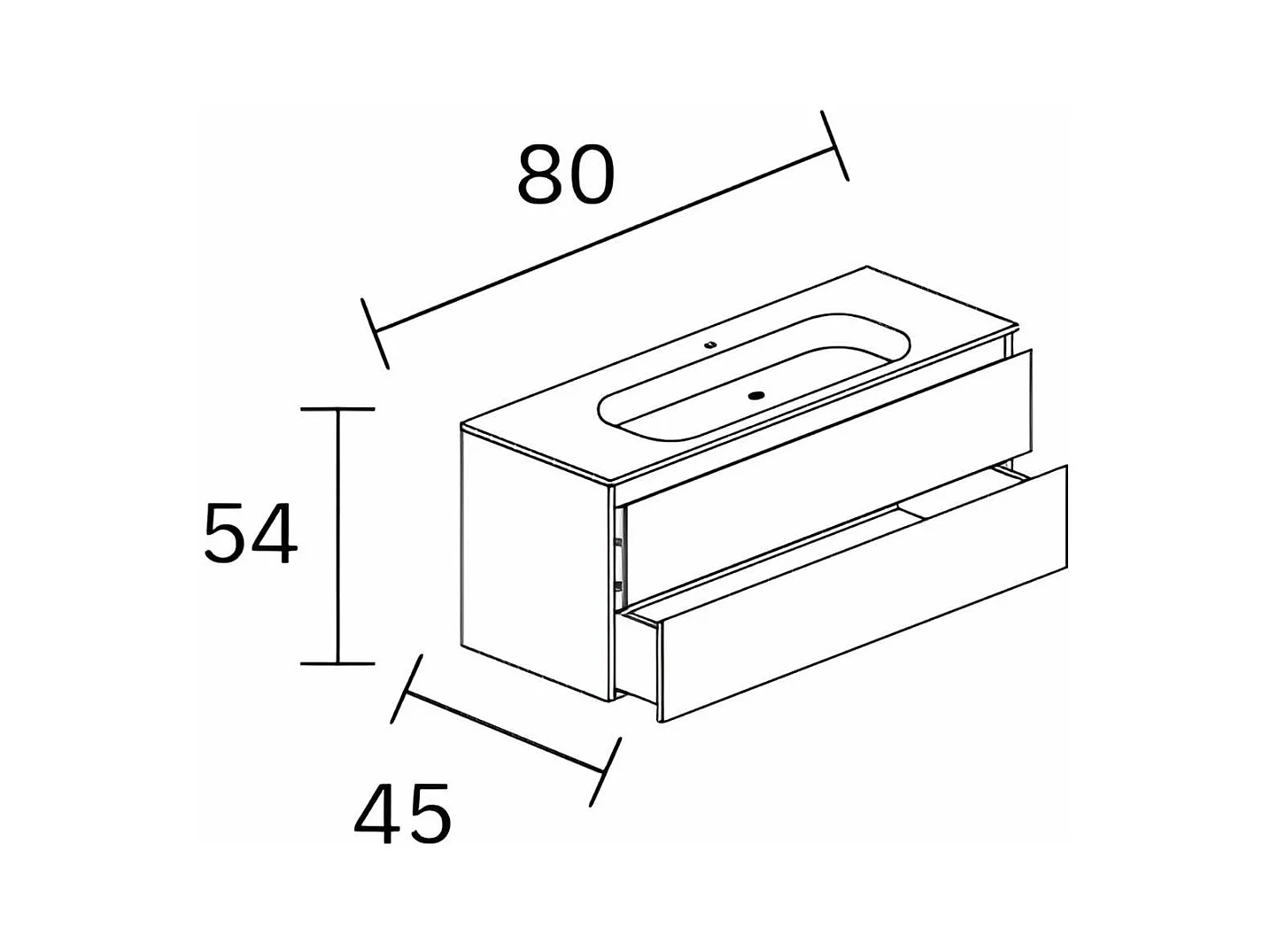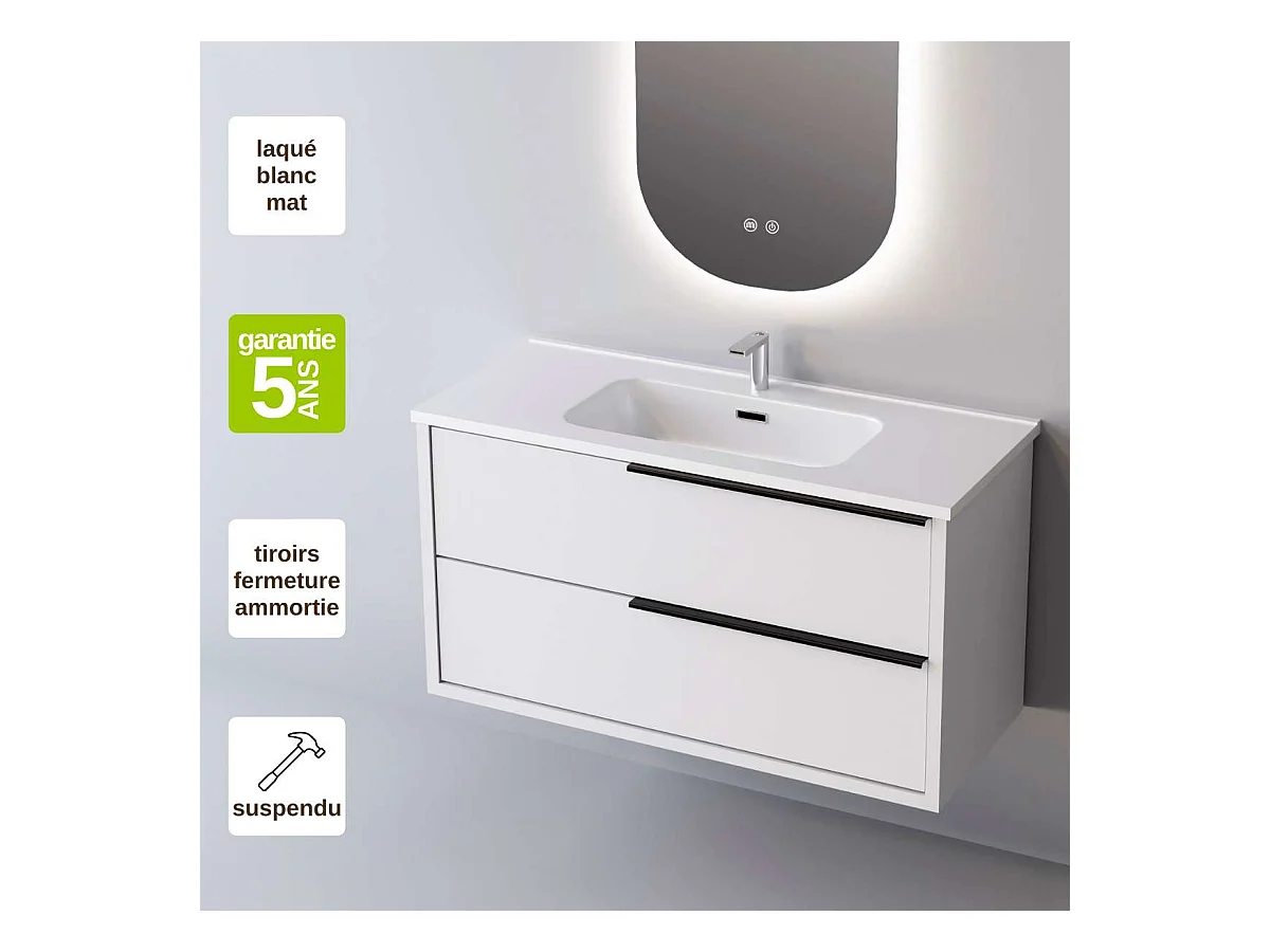 Meuble Salle de Bain LIKE (81 cm x H54 x P45 cm), Plan Vasque Solide Surface, 2 Tiroirs Poignée Noir, Laqué Blanc Mat