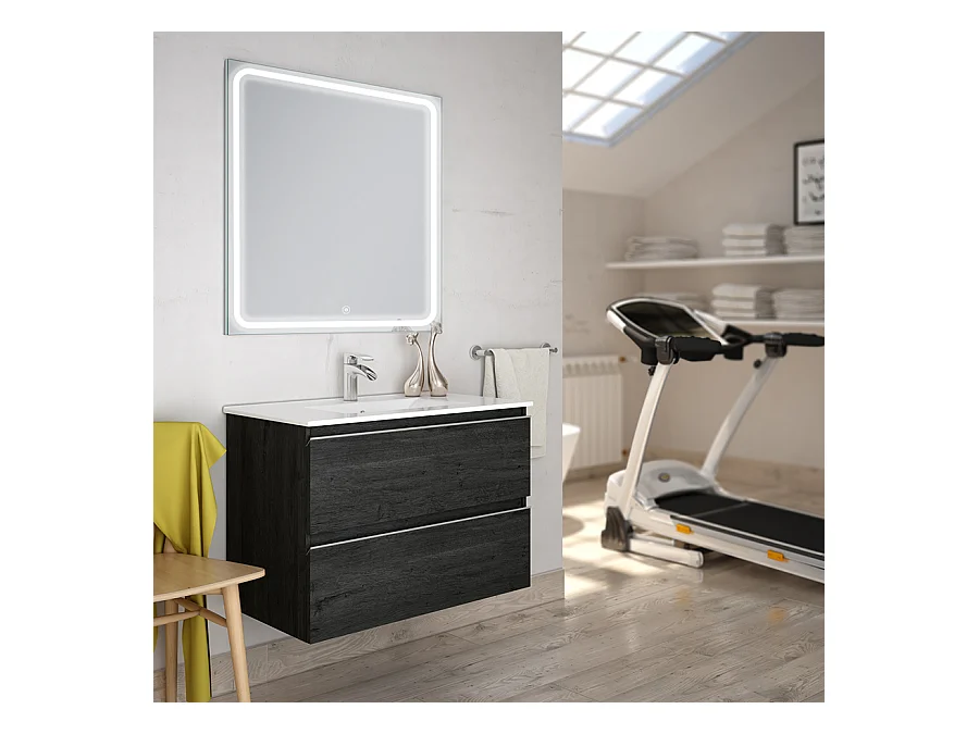 Meuble de salle de bain simple vasque - 2 tiroirs - BALEA et miroir Led VELDI - ebony (bois noir) - 60cm