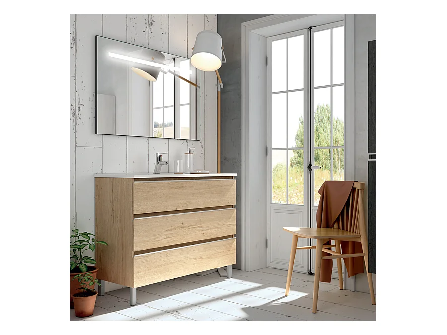 Meuble de salle de bain simple vasque - 3 tiroirs - PALMA et miroir Led STAM - bambou (chêne clair) - 80cm