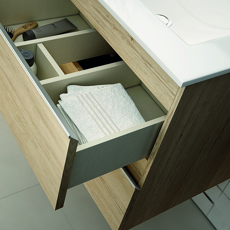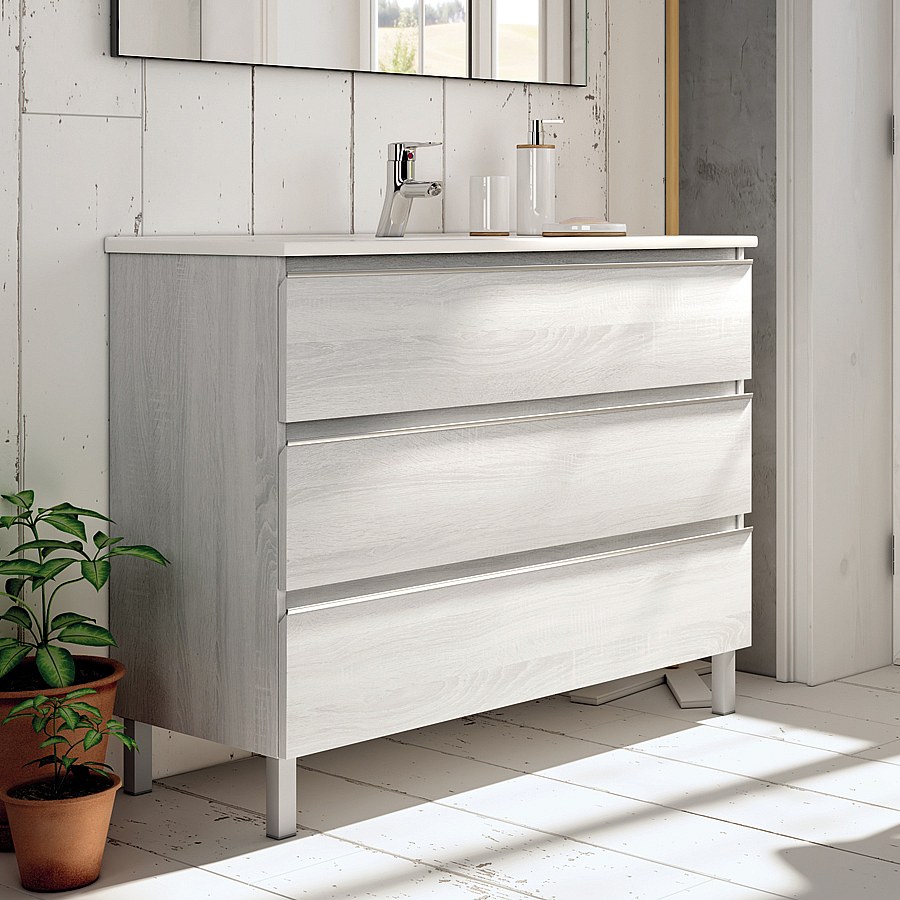 Meuble de salle de bain simple vasque - 3 tiroirs - PALMA et miroir rond Led SOLEN - hibernian (bois blanchi) - 80cm