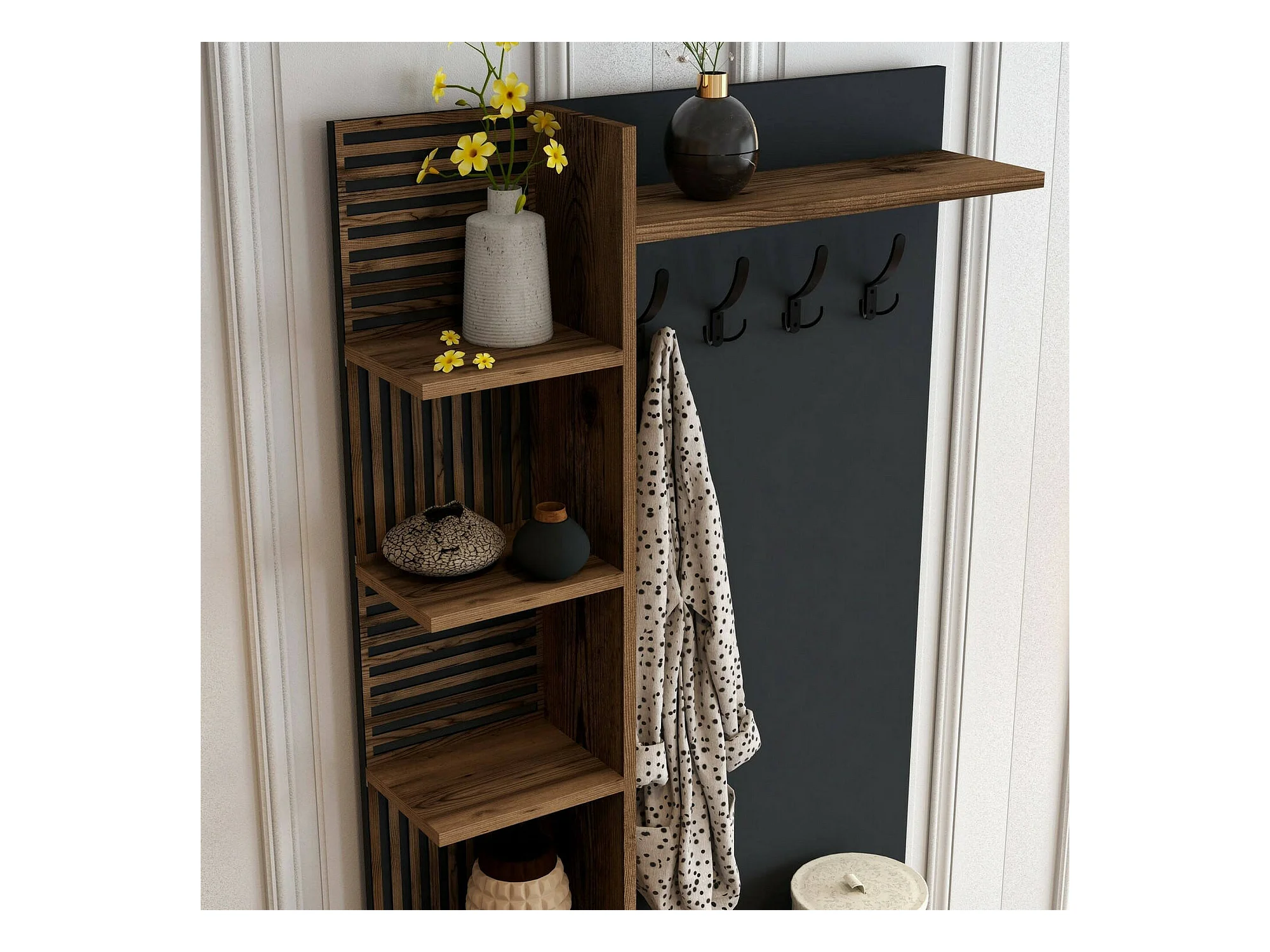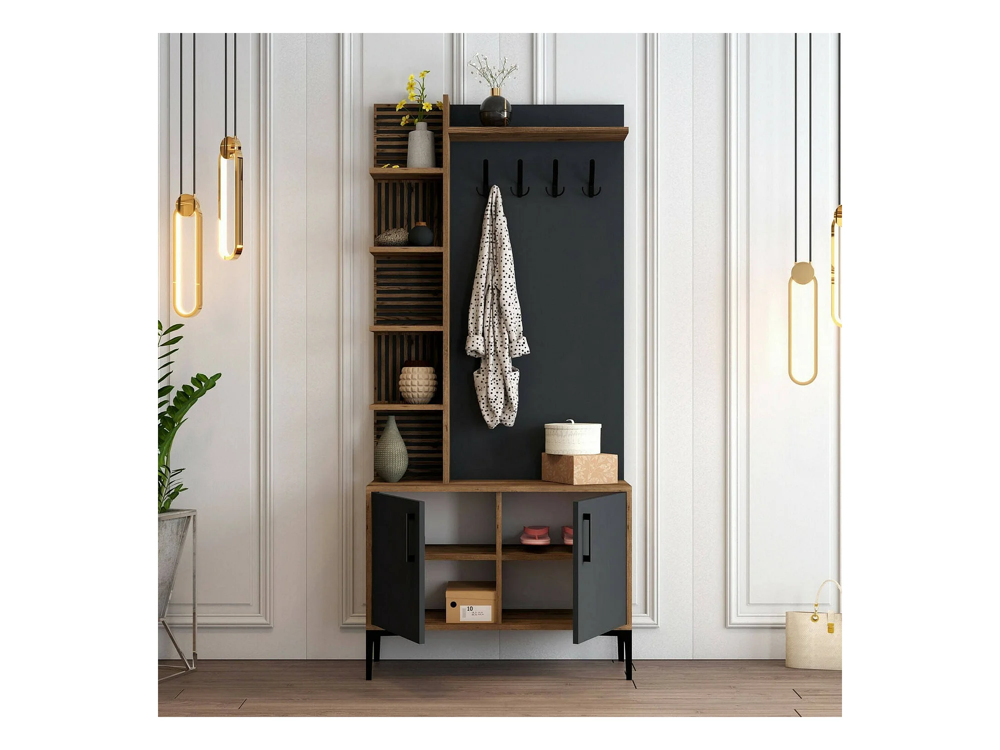 Meuble d'entrée Calista, Crochet d'entrée, Composition pour l'atrium, Console de rangement multifonction, 90x35h200 cm, Noyer et Anthracite