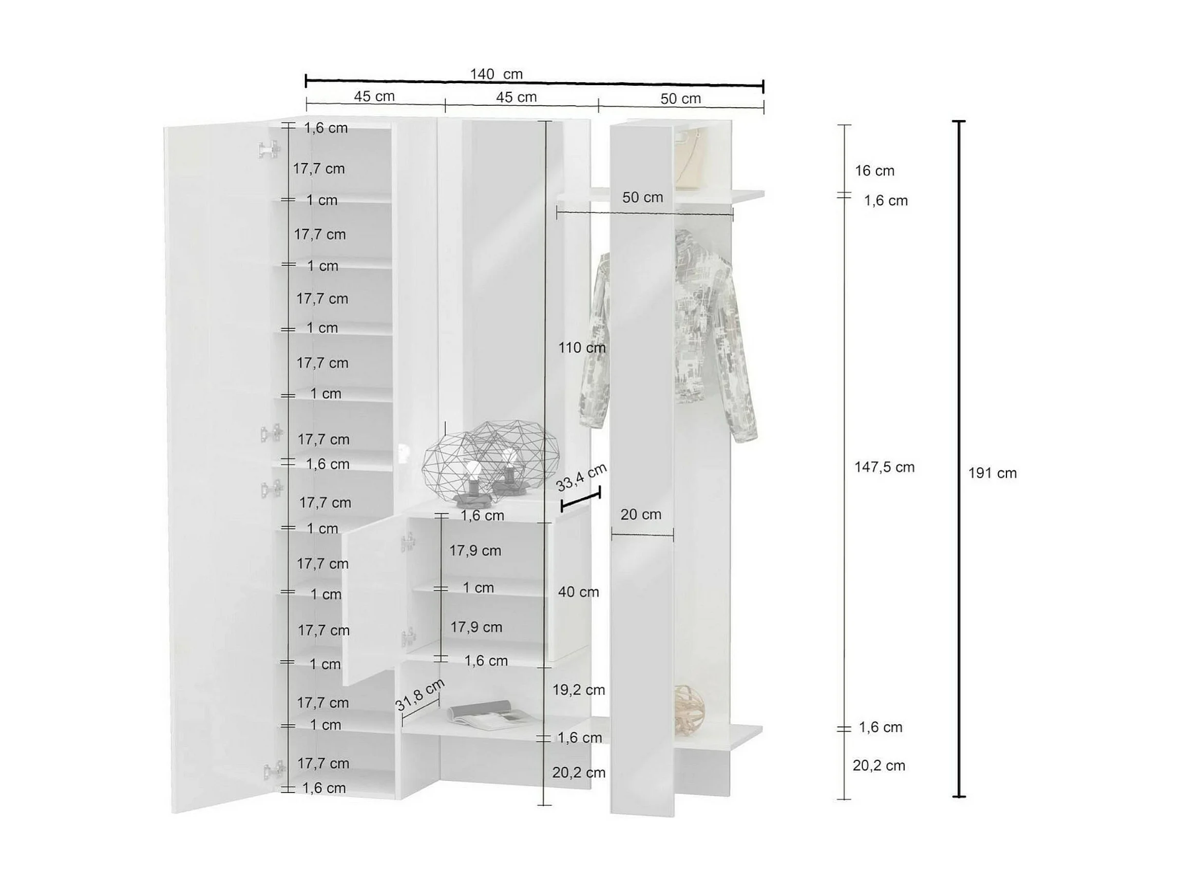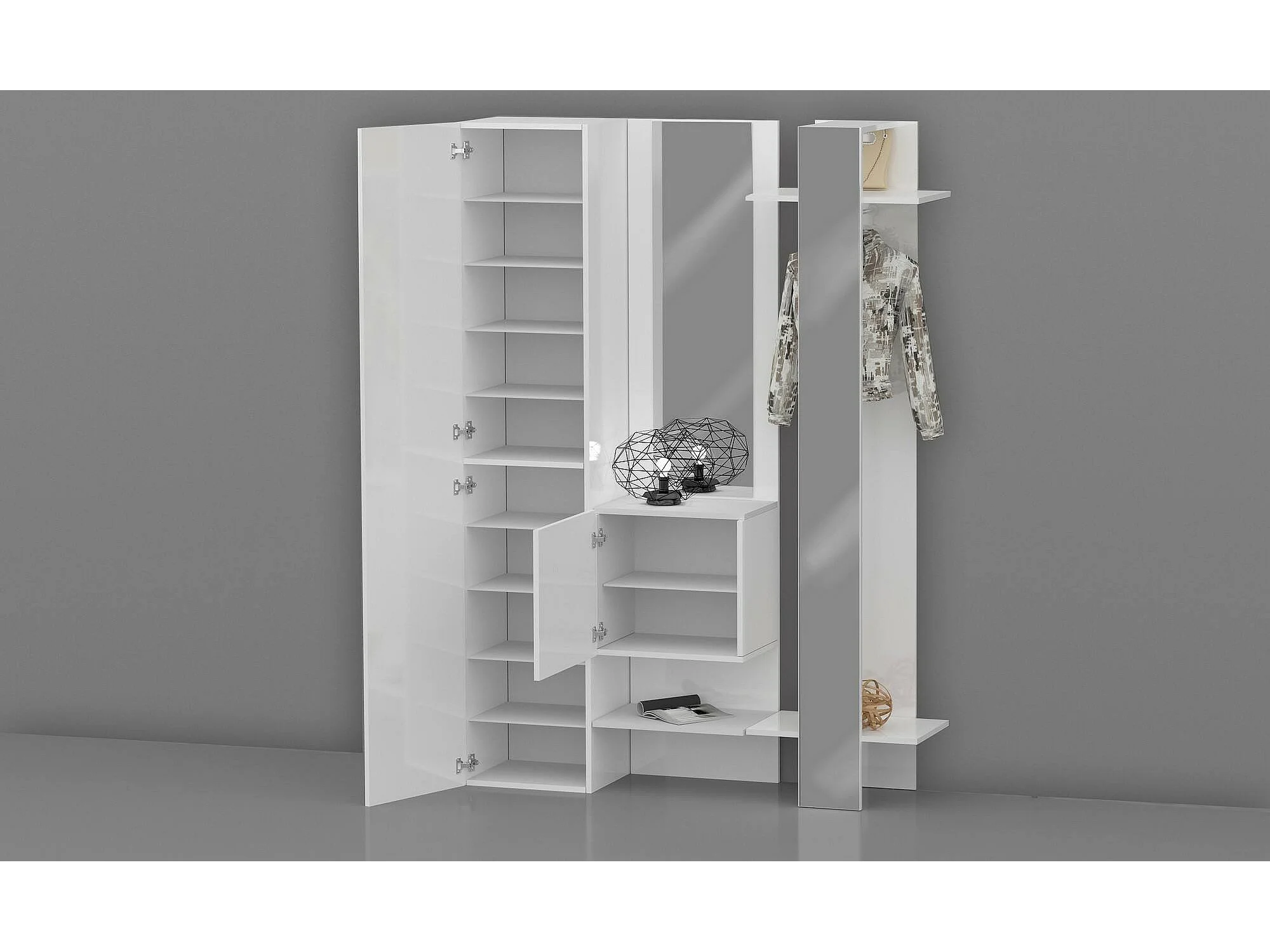 Meuble d'entrée Vilmaro, Armoire multifonctionnelle avec 2 portes, Cintre mural avec 2 miroirs, 140x35h190 cm, Blanc