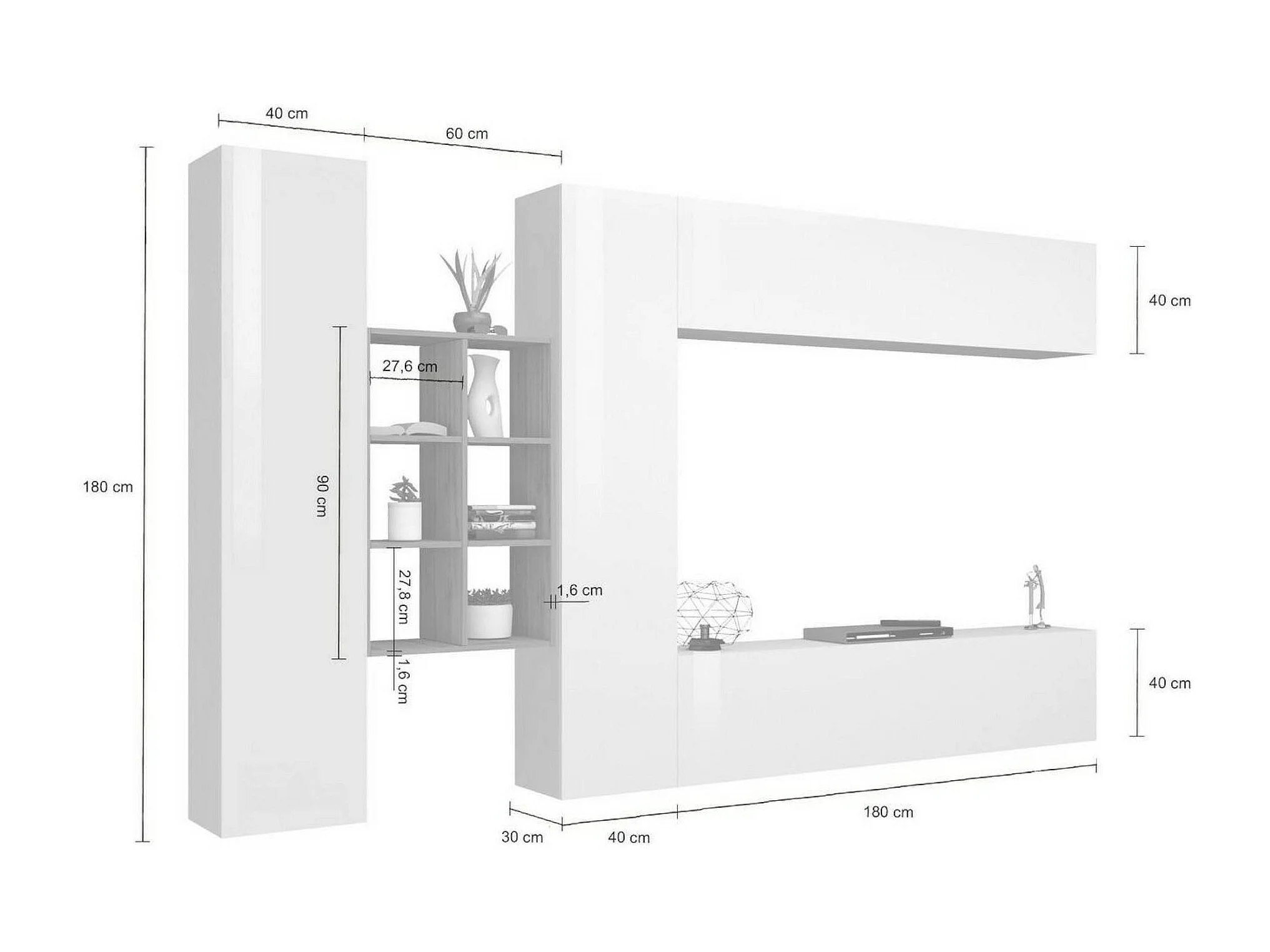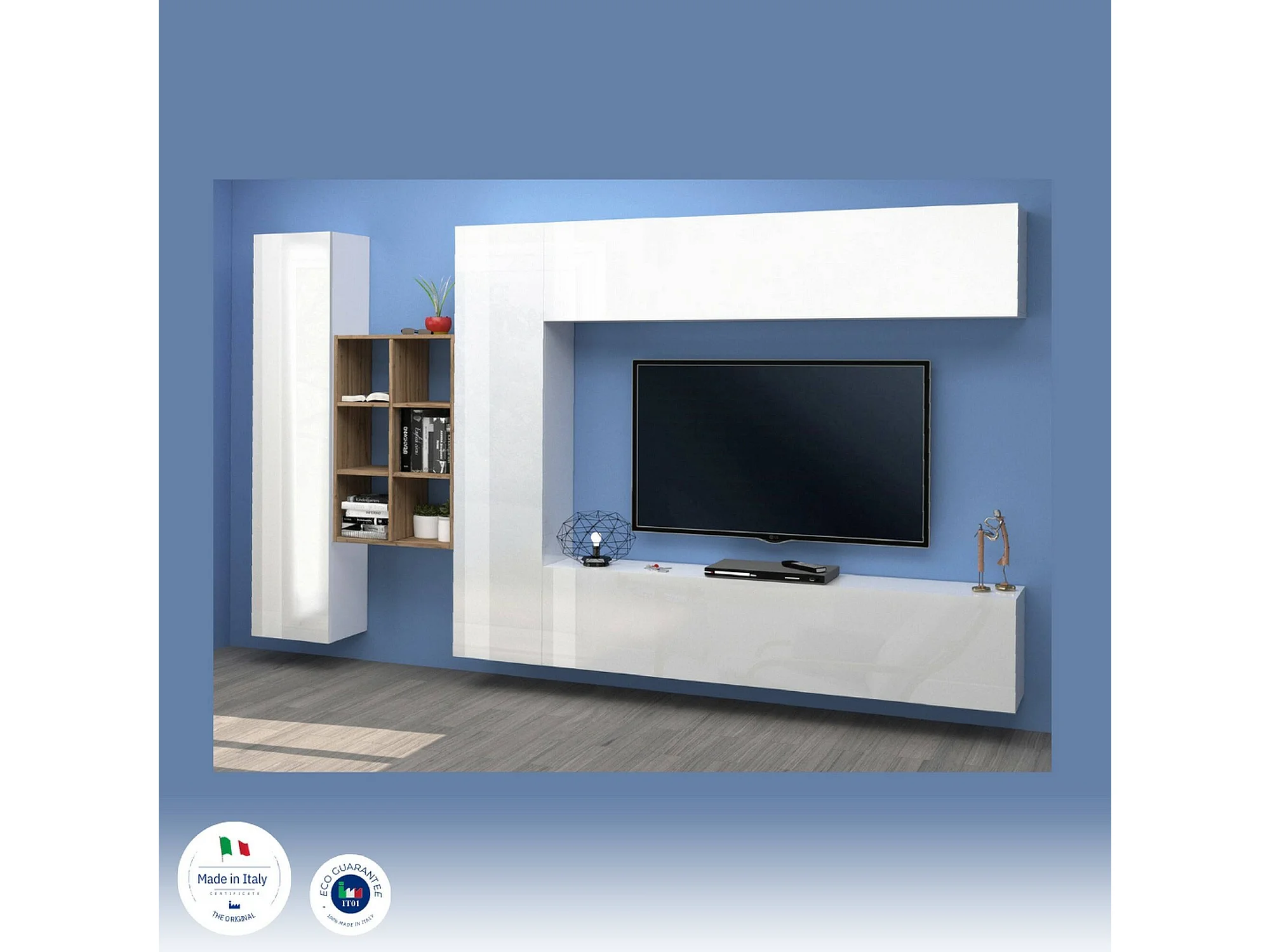 Élément mural Danilo, meuble TV 4 portes, Meuble de salon polyvalent, 100% Made in Italy, 280x30h180 cm, Blanc brillant et érable
