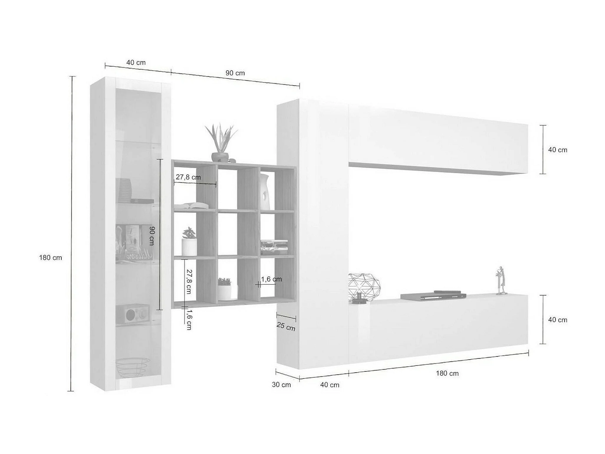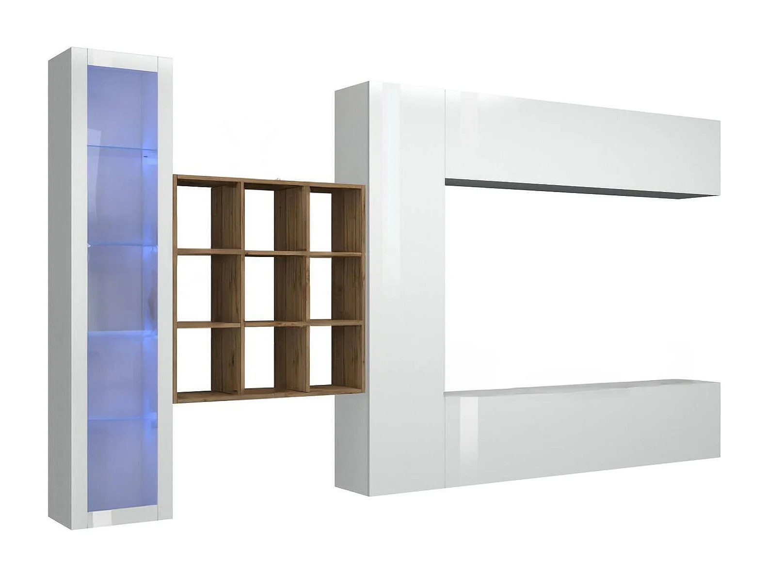 Élément mural Dcolle, meuble TV 4 portes, Meuble de salon polyvalent avec vitrine et lumière LED, 100% Made in Italy, 310x30h180 cm, Blanc brillant et érable