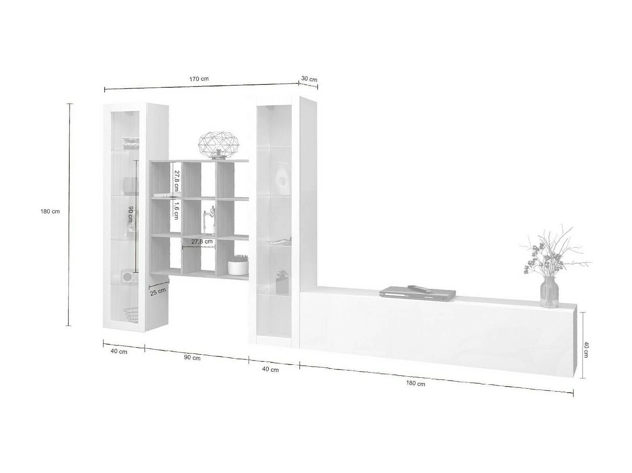 Élément mural Dchiorr, meuble TV 3 portes, Meuble de salon polyvalent avec vitrine et lumière LED, 100% Made in Italy, 350x30h180 cm, Blanc brillant et érable