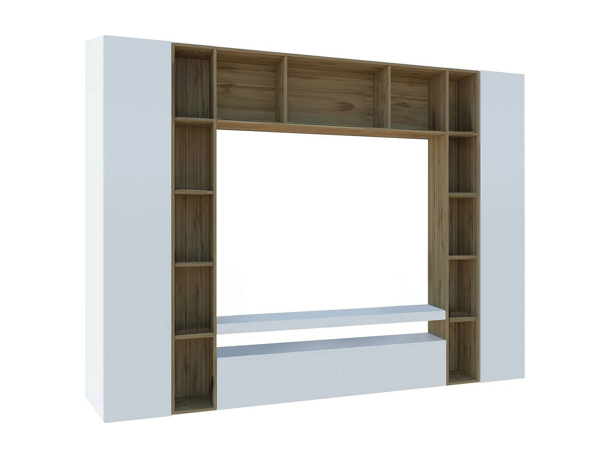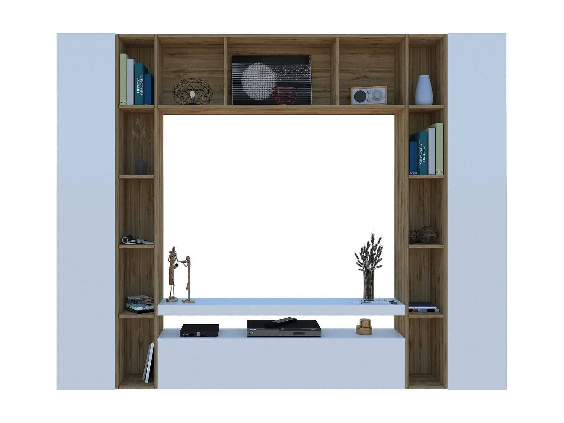 Élément mural Ddragon, meuble TV 3 portes, Meuble de salon polyvalent, 100% Made in Italy, 270x35h210 cm, Blanc brillant et chêne