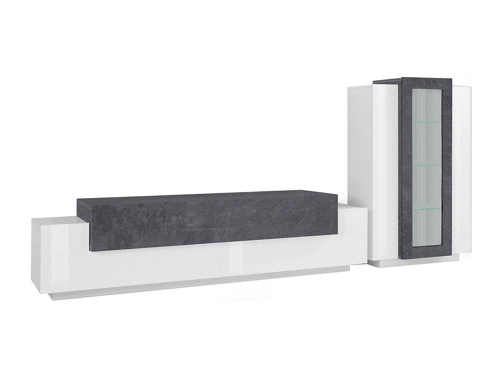 Système mural Djazir, ensemble de salon meuble TV, meuble de salon polyvalent, 100% Made in Italy, 280x45h121 cm, blanc brillant et ardoise