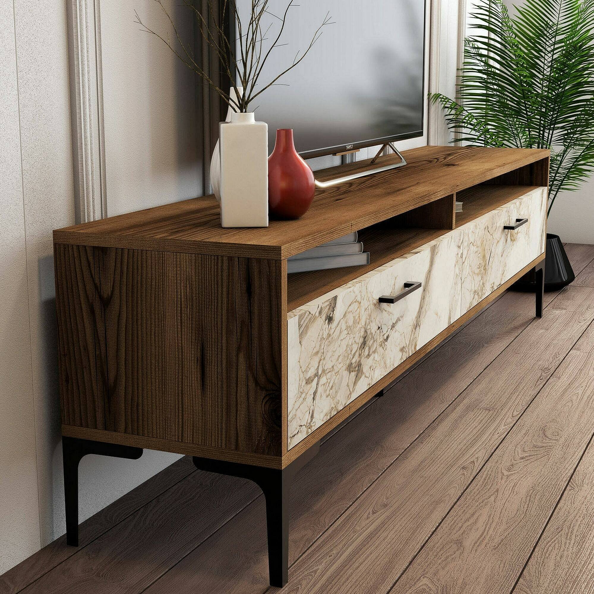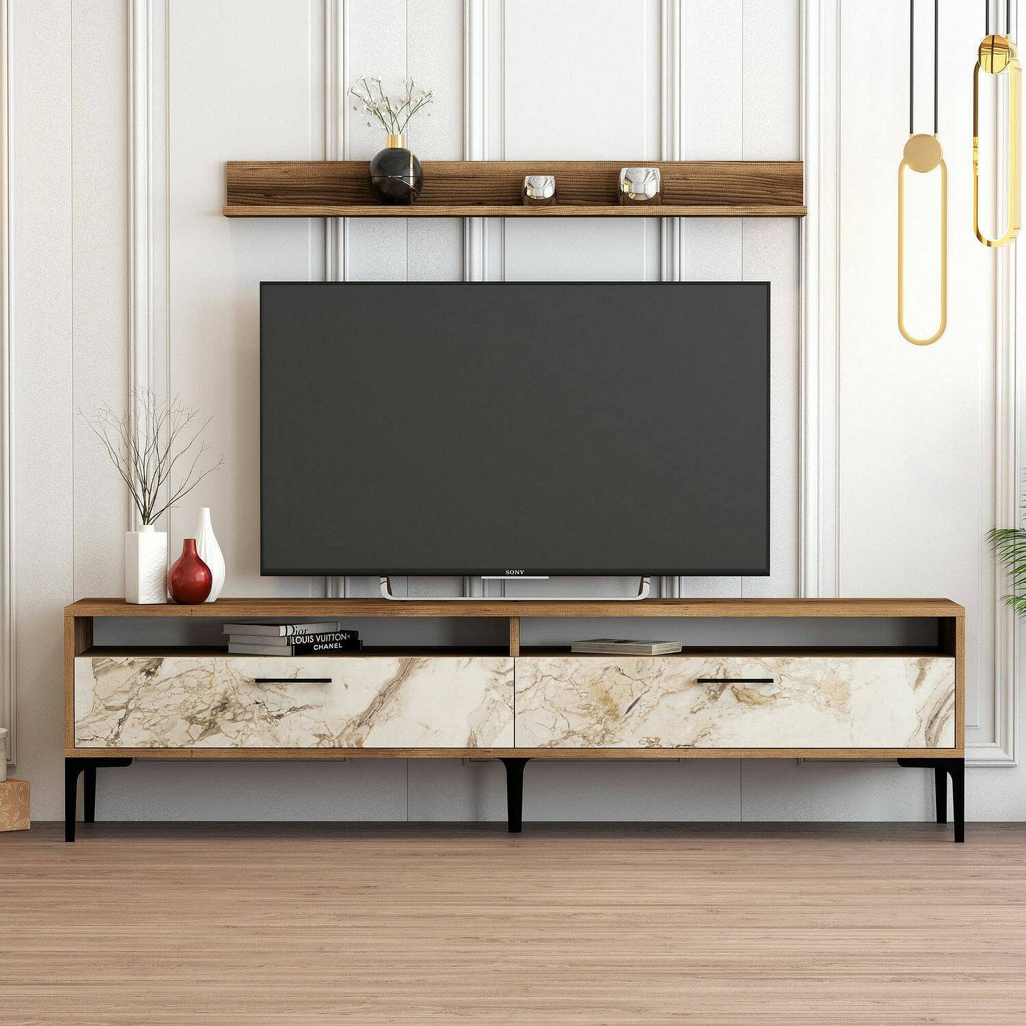 Meuble Mural Edasich, Composition du salon, Meubles de salon polyvalents, Meuble télé, 180x35h47 cm, Noyer et Marbre Blanc