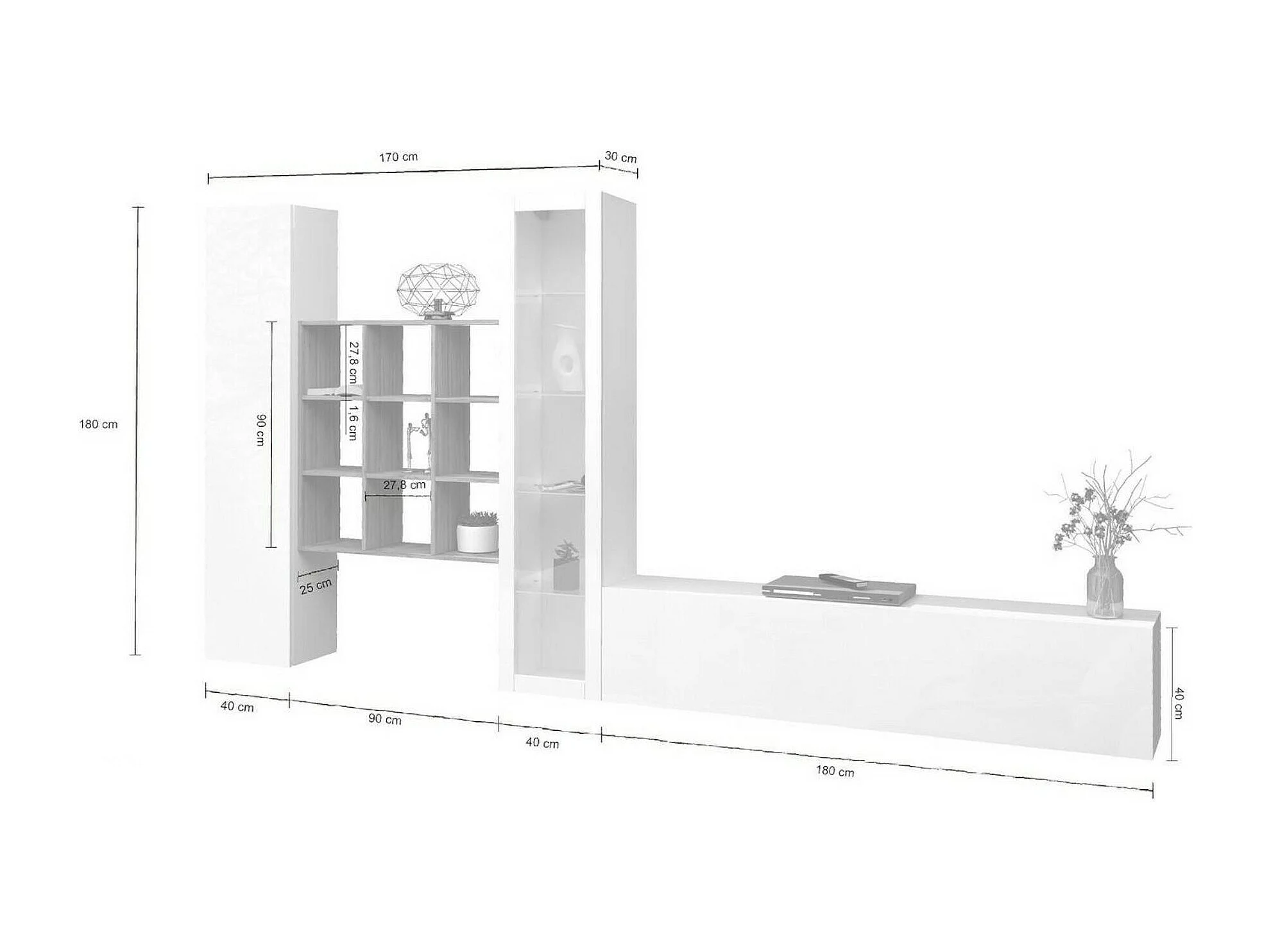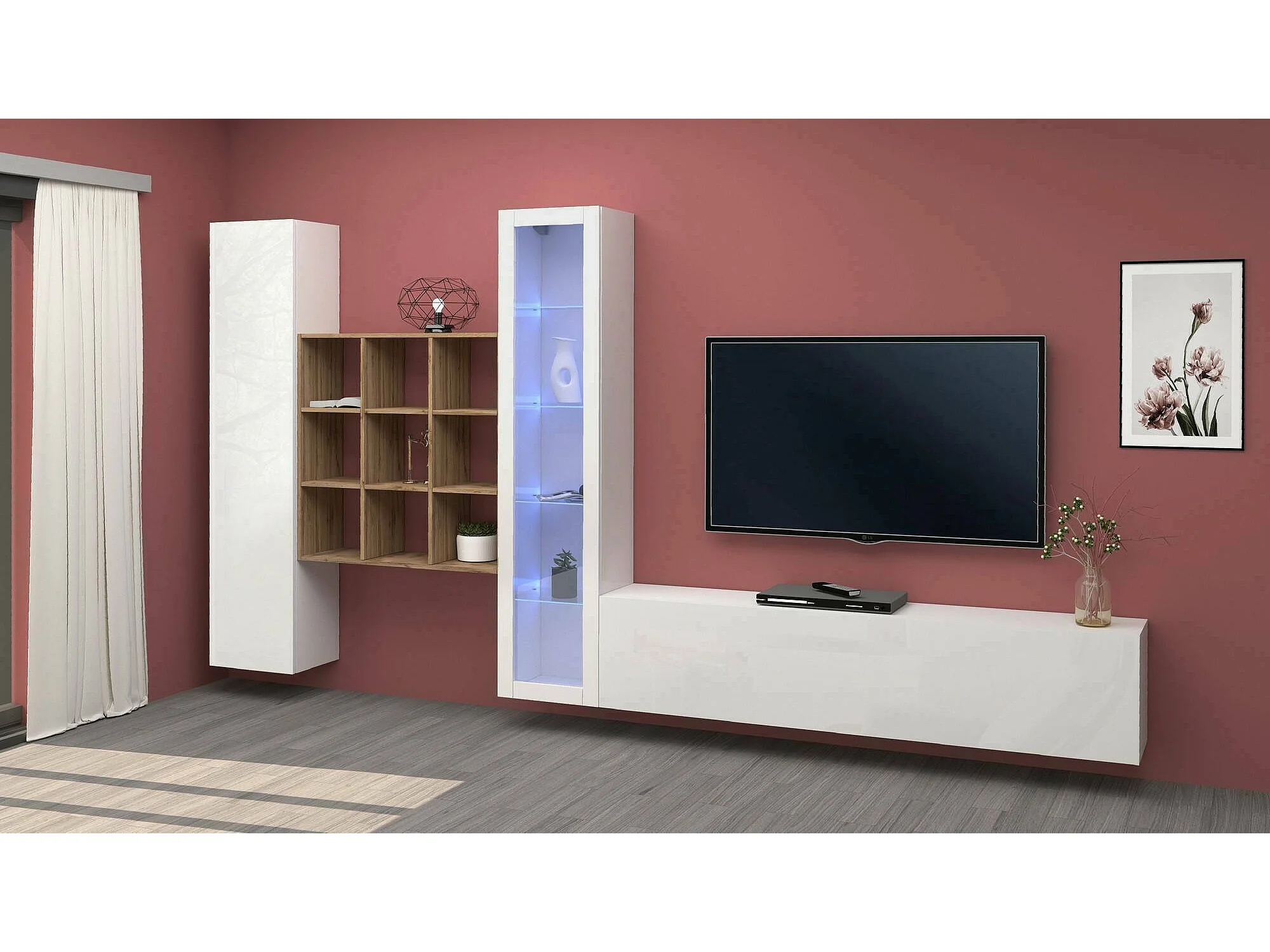 Système mural Davis, meuble TV 3 portes, Meuble de salon polyvalent avec vitrine et lumière LED, 100% Made in Italy, 310x30h180 cm, Blanc brillant et Érable