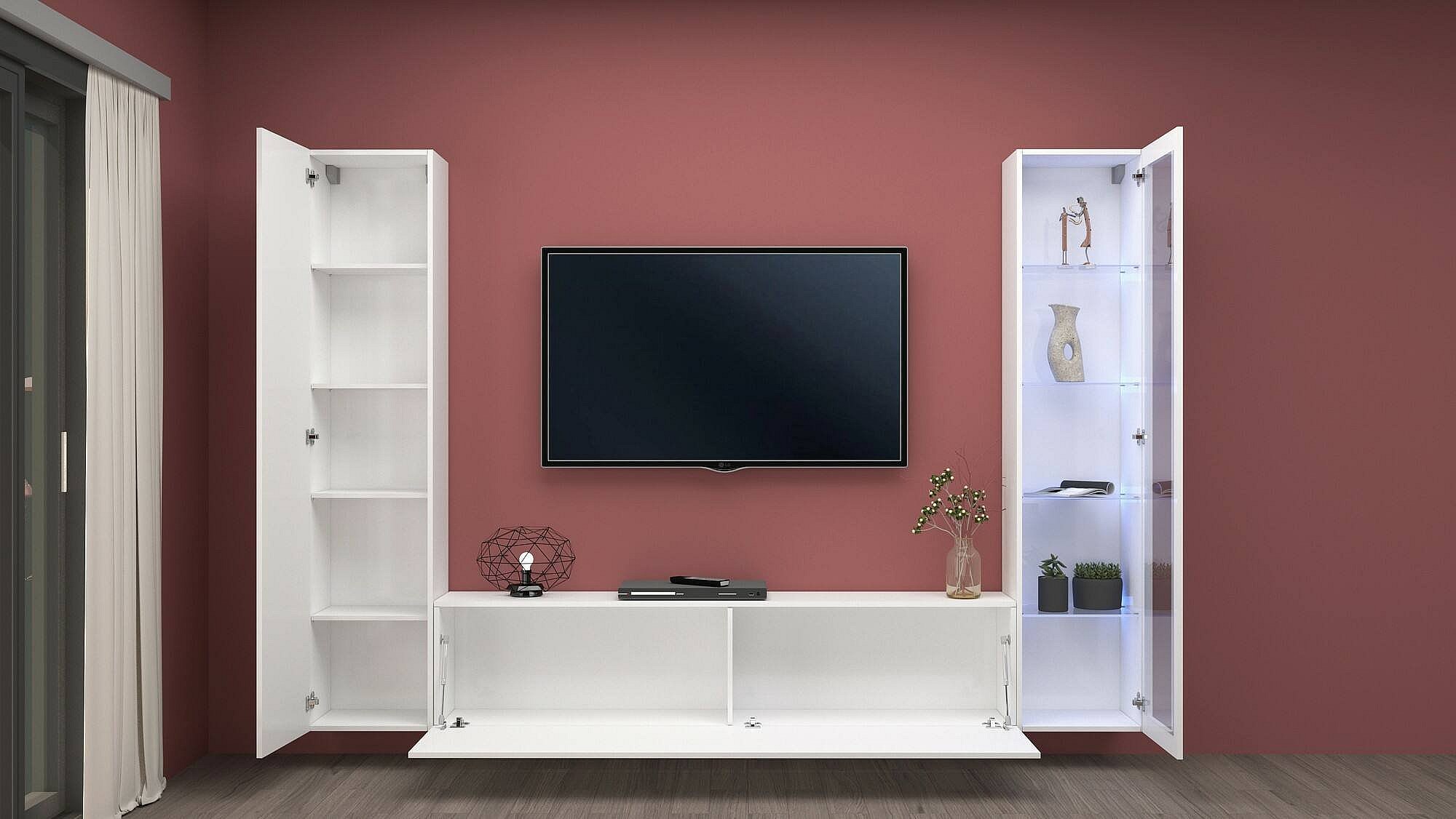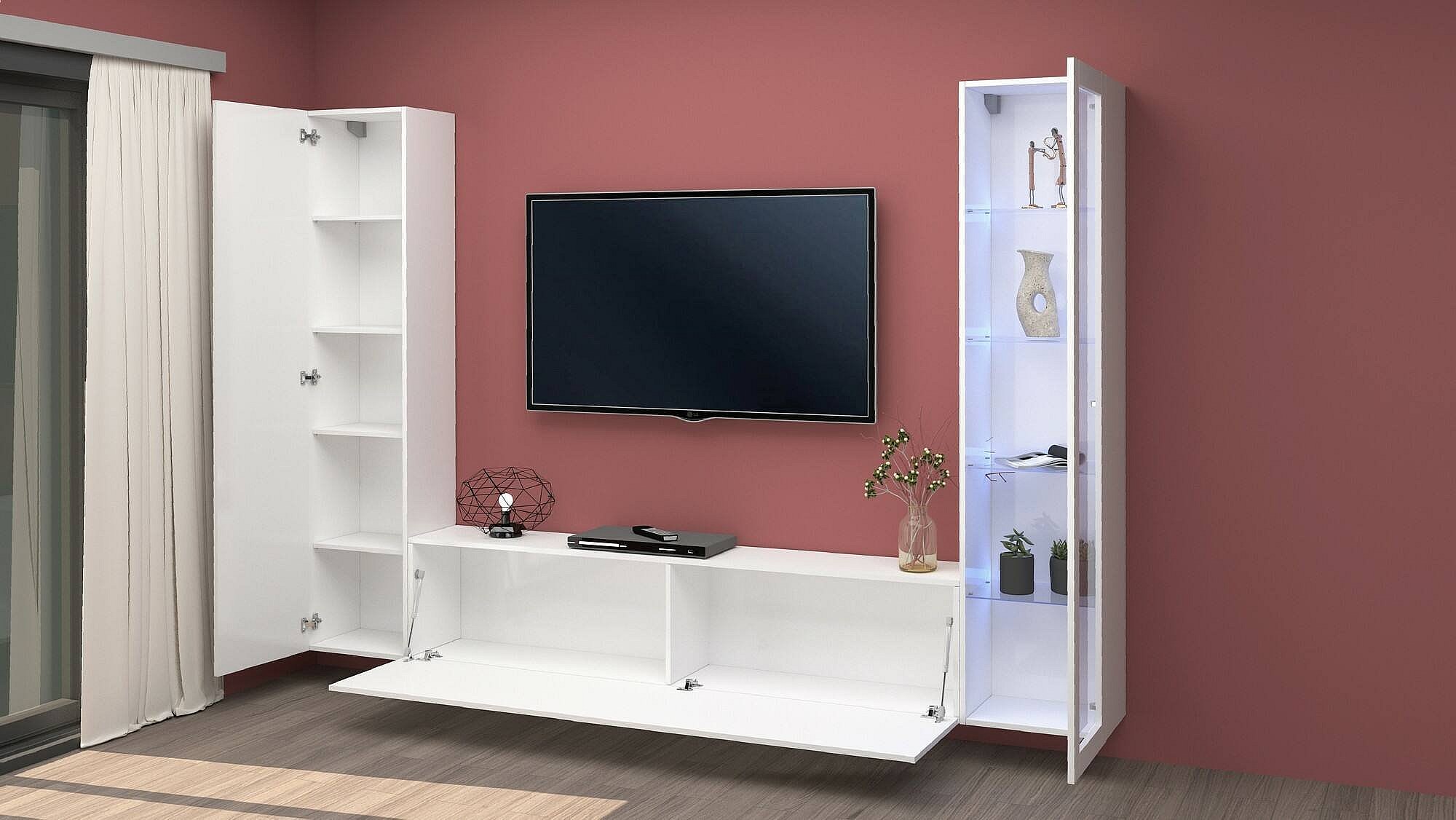 Système mural Girolamo, meuble TV 3 portes, Meuble de salon polyvalent avec vitrine et lumière LED, 100% Made in Italy, 260x30h180 cm, Blanc brillant