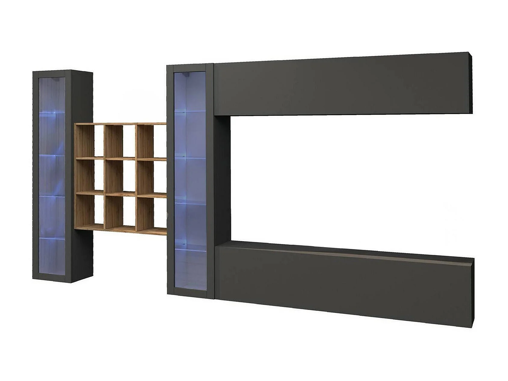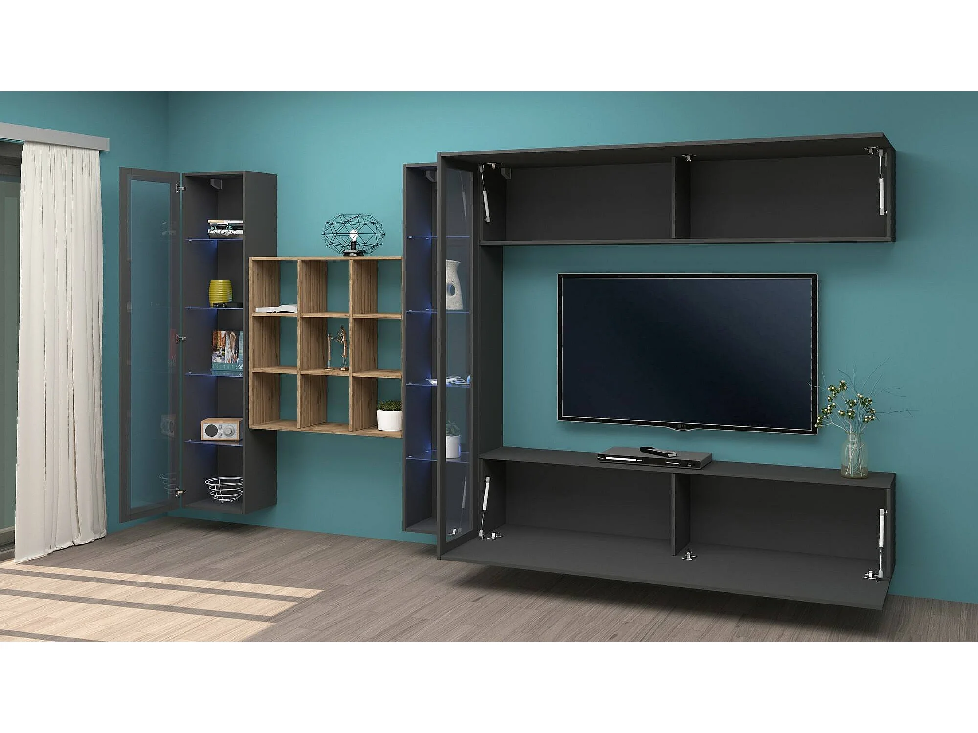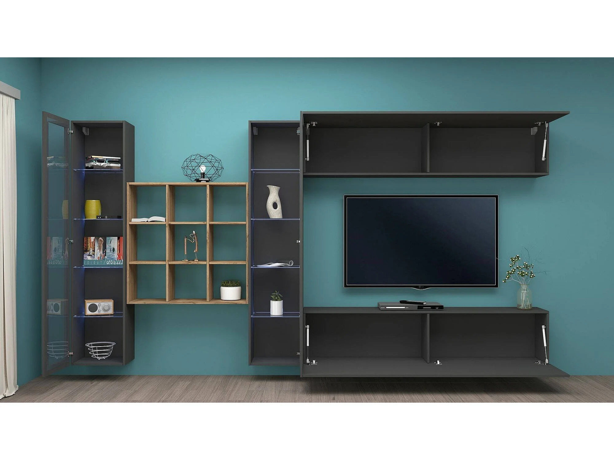 Système mural Gustavo, ensemble de salon meuble TV 4 portes, meuble de salon polyvalent avec vitrine et lumière LED, 100% Made in Italy, 350x30h180 cm, Anthracite