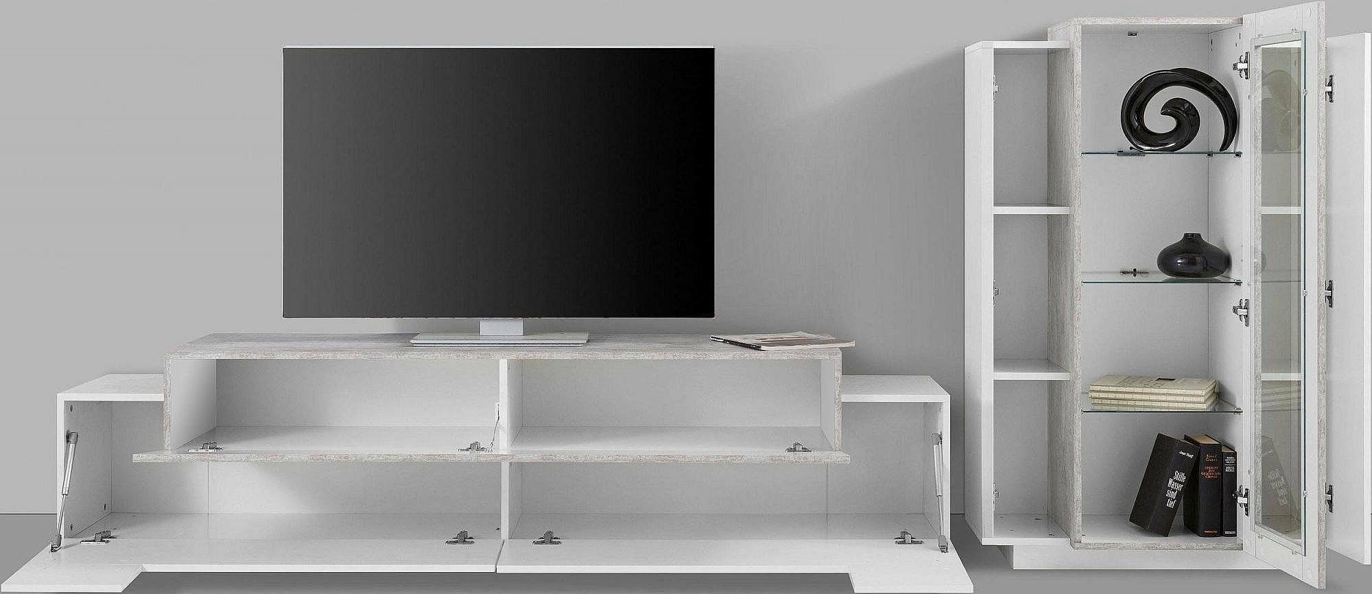 Système mural Mirko, ensemble de salon meuble TV, meuble de salon polyvalent, 100% Made in Italy, 280x45h121 cm, blanc brillant et béton